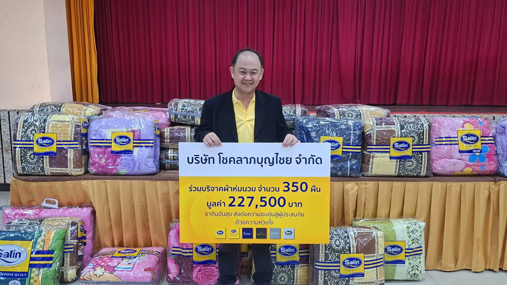 นายรัฏฐพิชญ์ ชัยศรีสุขอําพร ผู้จัดการทั่วไป บริษัท โชคลาภบุญไชย จํากัด กล่าวว่า ในนามของบริษัทฯ และแบรนด์ซาติน เราขอส่งต่อความ ห่วงใยและกําลังใจไปถึงพี่น้องชาวอุตรดิตถ์ทุกท่านผ่านผ้าห่มนวมที่มอบให้ในครั้งนี้ ซึ่งเป็นส่วนหนึ่งของความปรารถนาดีจากพวกเราที่หวังให้ ทุกครอบครัวก้าวผ่านช่วงเวลานี้ไปได้โดยเร็ว เราพร้อมเป็นแรงสนับสนุนในการฟื้นฟูและเยียวยาผู้ได้รับผลกระทบจากภัยพิบัติในครั้งนี้