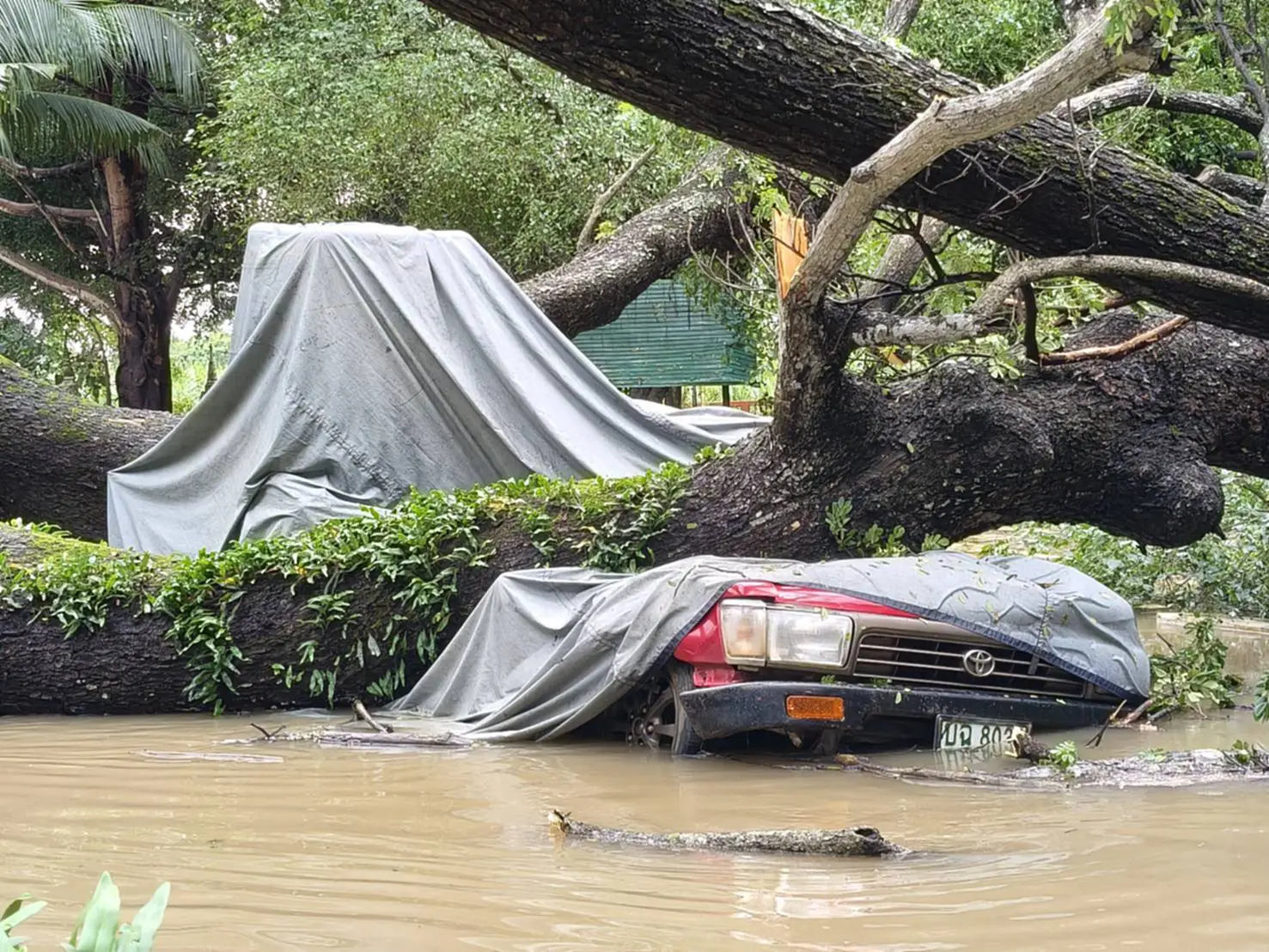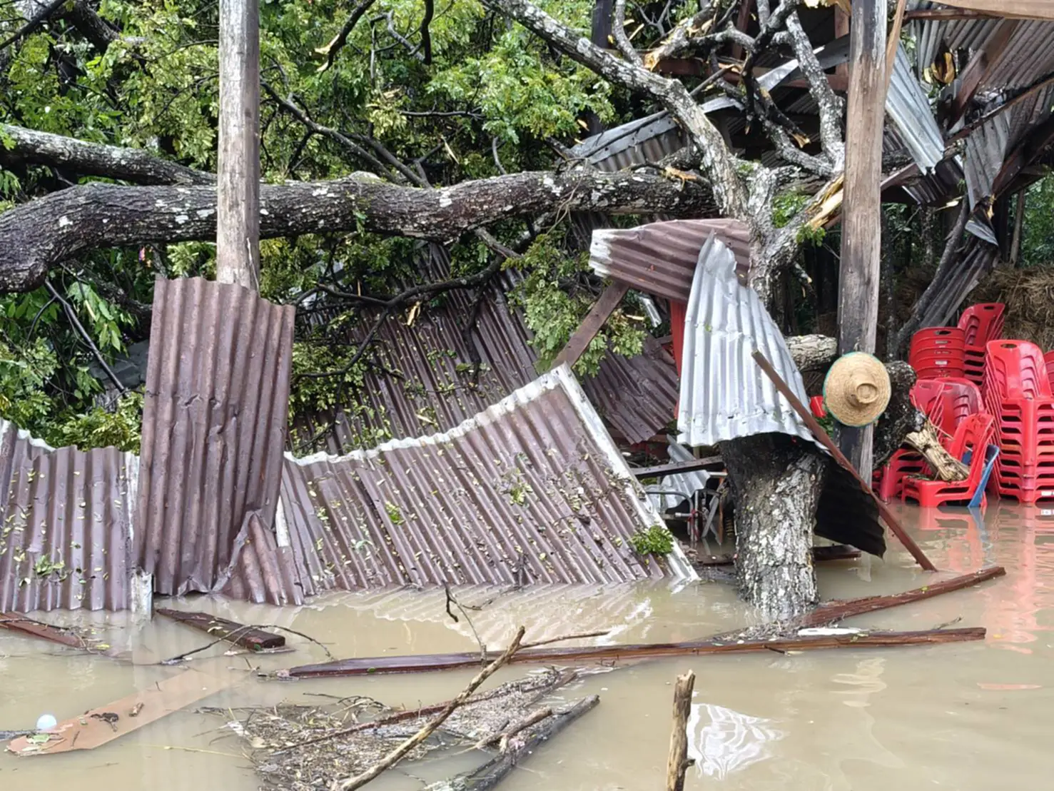 สุโขทัย ฝนตกหนักติดต่อกันสองวันทำให้น้ำท่วม เผาศพไม่ได้แถมมีต้นจามจุรีขนาดใหญ่อายุกว่าร้อยปีโค่นทับรถปิคอัพและรถจักรยานยนต์ที่จอดใต้ต้นจามจุรีพังเสียหาย