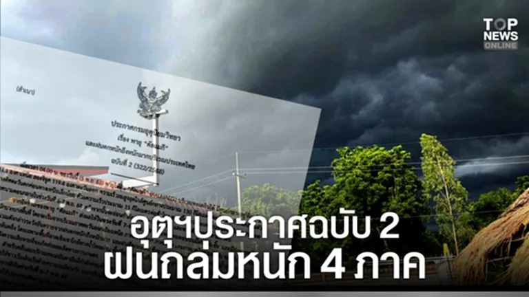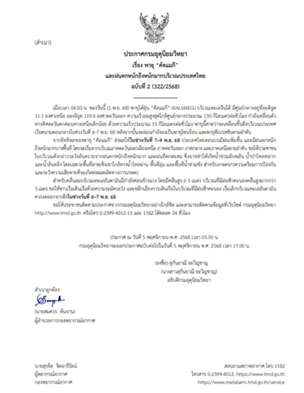 วันที่ 5 พ.ย. 68 กรมอุตุนิยมวิทยา ประกาศ เรื่อง พายุ “คัลแมกี” และฝนตกหนักถึงหนักมากบริเวณประเทศไทย ฉบับที่ 2 (322/2568)