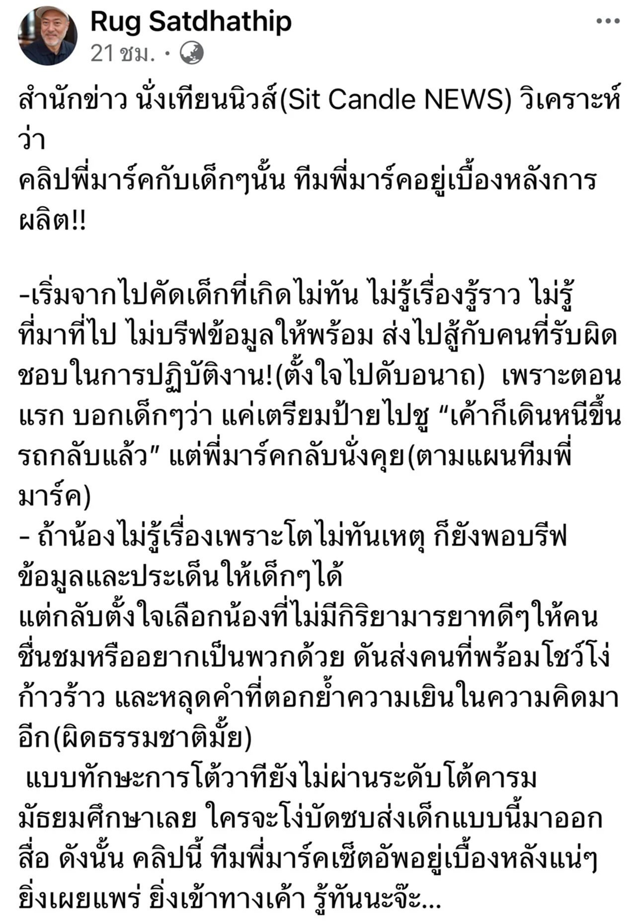 นายศรัทธา ศรัทธาทิพย์ นักแสดงอิสระ ครูสอนการแสดง และผู้กำกับ โพสต์ข้อความผ่านเฟซบุ๊กส่วนตัวว่า สำนักข่าวนั่งเทียนนิวส์ (Sit Candle NEWS) วิเคราะห์ว่าคลิปพี่มาร์คกับเด็ก ๆ นั้น ทีมพี่มาร์คอยู่เบื้องหลังการผลิต!!