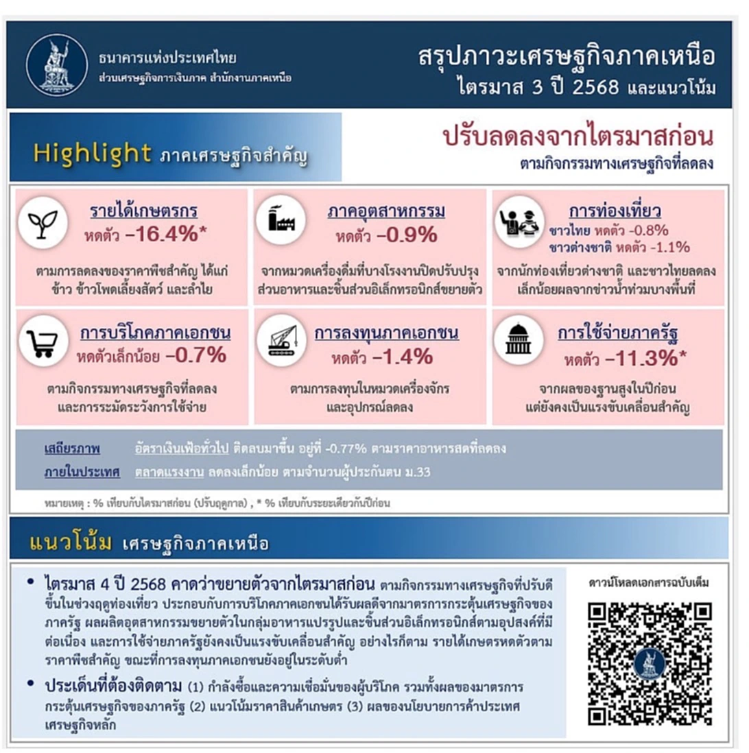 ธปท. ภาคเหนือ แถลงข่าว ไตรมาส 3 ปี 2568 ภาวะเศรษฐกิจการเงินภาคเหนือ ปรับลดลง