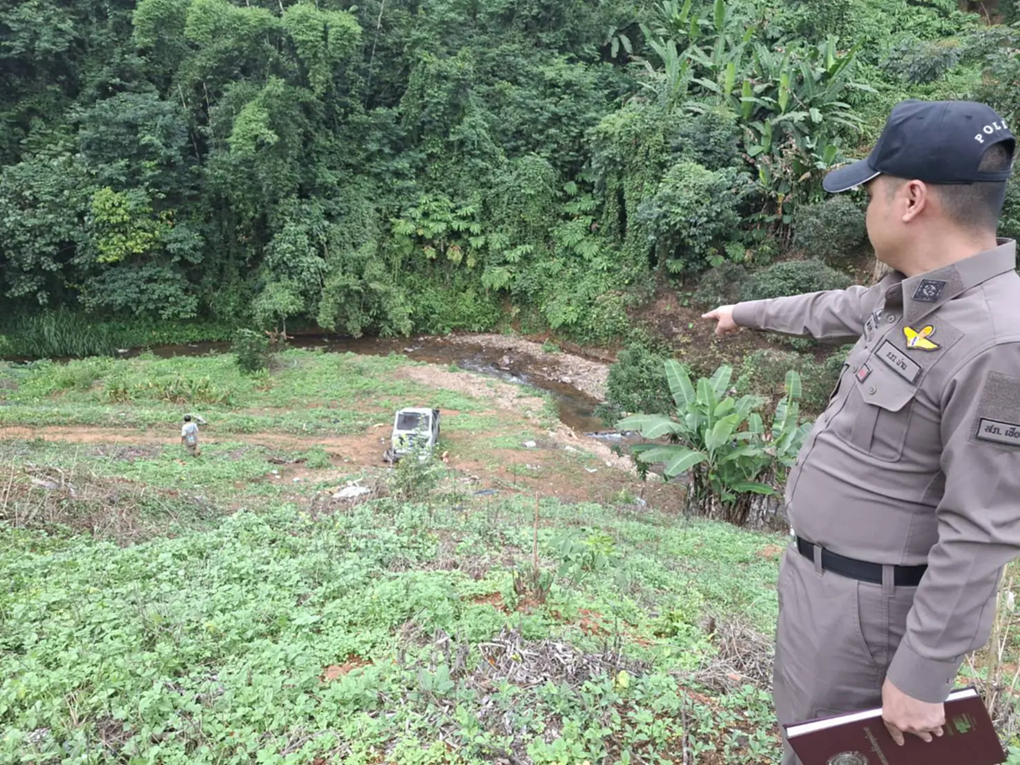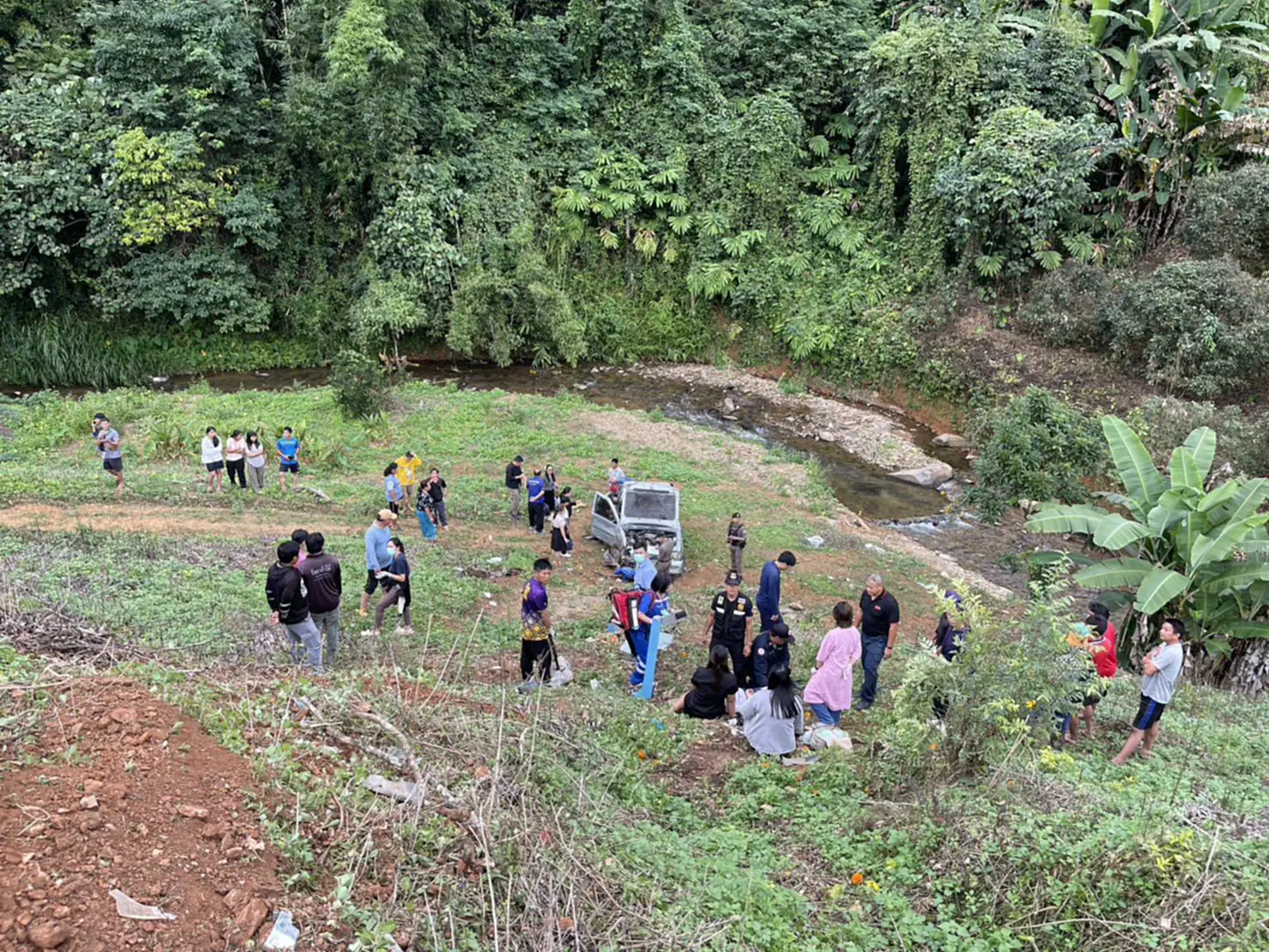 วันที่ 5 พฤศจิกายน 2568 เวลา 13.27 น. ร.ต.ท.วิทิต ทิวาคำ พนักงานสอบสวน สภ.เชียงกลาง จ.น่าน ได้รับแจ้งจากศูนย์วิทยุนครน่าน 191 ว่าเกิดอุบัติเหตุรถกระบะบรรทุกครูและนักเรียนตกเขา บริเวณช่วงสะพานลงดอยห้วยชี ถนนสายบ้านเจดีย์–บ้านเกวต เขตบ้านร่มไทร ต.เชียงกลาง อ.เชียงกลาง จ.น่าน จึงรายงานให้ พ.ต.อ.จักรชัย หมั่นพลู ผกก.สภ.เชียงกลาง ทราบ ก่อนประสาน สำนักงาน ปภ.น่าน สาขาเชียงกลาง หน่วยกู้ชีพ–กู้ภัย อปท.พื้นที่ และ รพ.เชียงกลาง รุดเข้าช่วยเหลือ