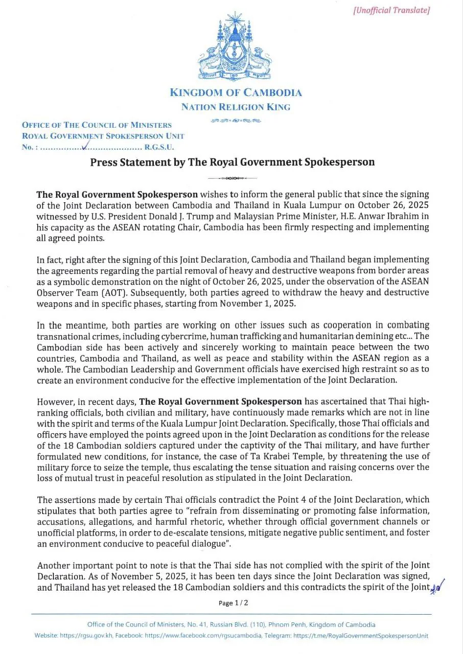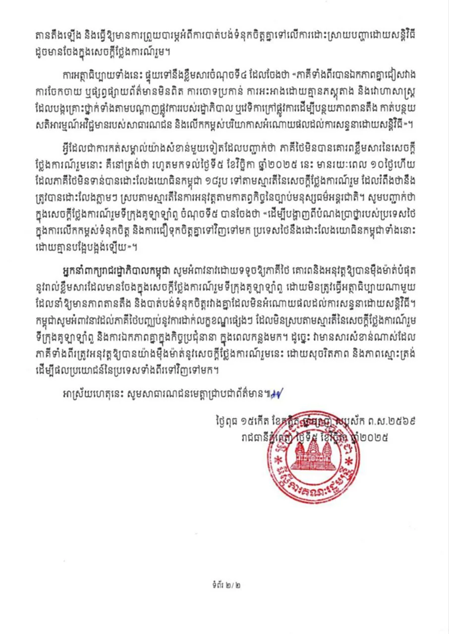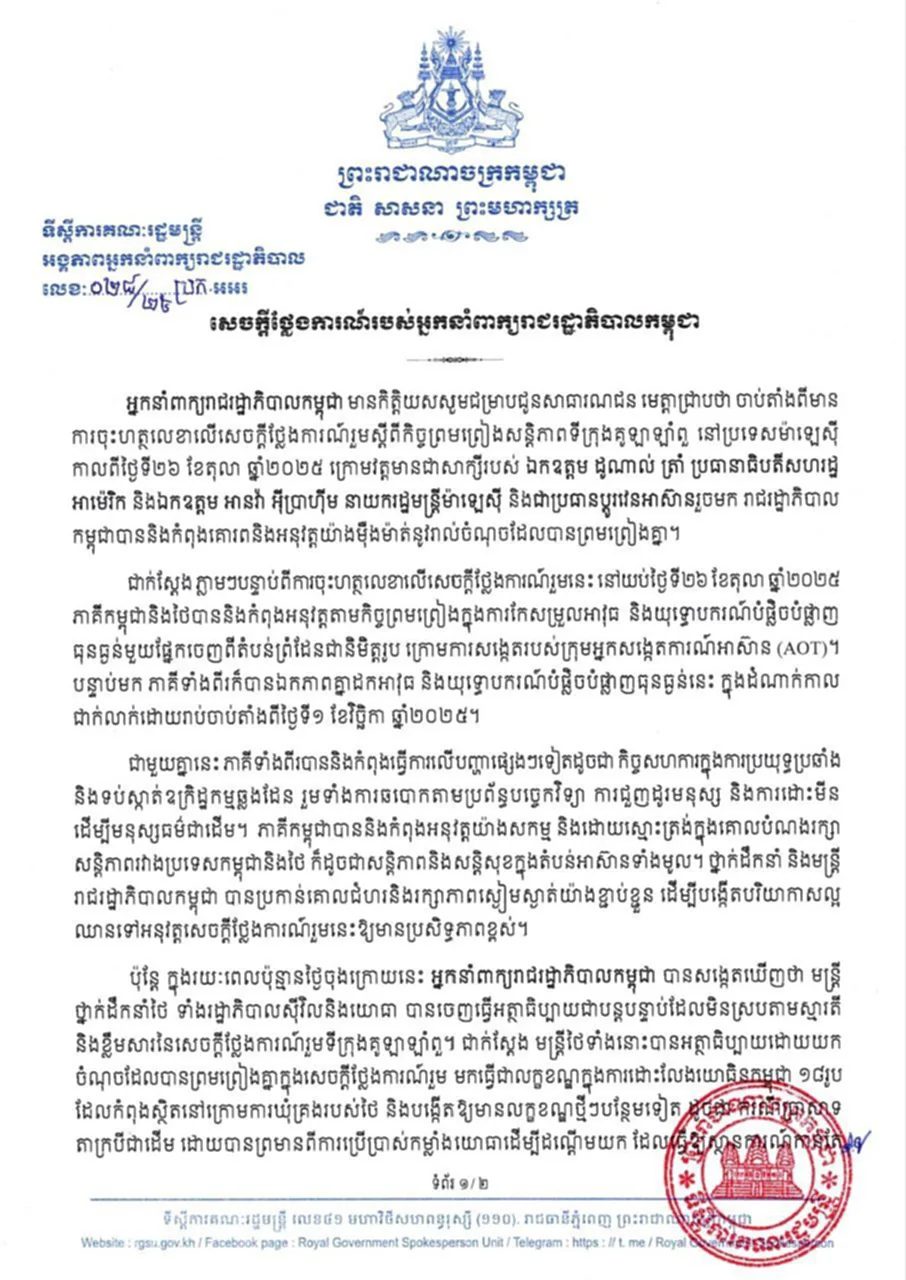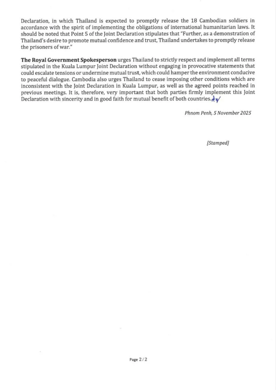โฆษกรัฐบาลกัมพูชาระบุว่า “ขอแจ้งให้สาธารณชนทั่วไปทราบว่า นับตั้งแต่การลงนามปฏิญญาร่วมระหว่างกัมพูชาและไทย ณ กรุงกัวลาลัมเปอร์ เมื่อวันที่ 26 ตุลาคม 68 ซึ่งมีประธานาธิบดีสหรัฐฯ โดนัลด์ ทรัมป์ และนายกรัฐมนตรีมาเลเซีย อันวาร์ อิบราฮิม ในฐานะประธานอาเซียน เป็นสักขีพยาน กัมพูชาได้เคารพและปฏิบัติตามข้อที่ตกลงกันไว้ทุกประการอย่างเคร่งครัด