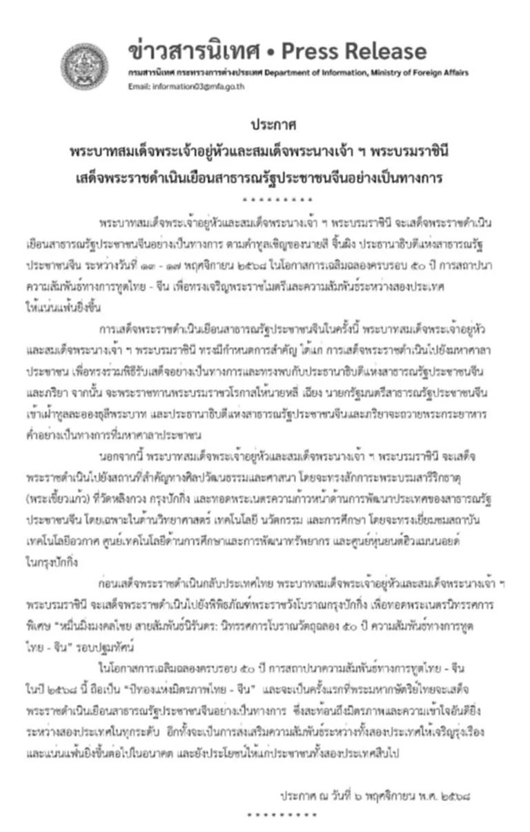 6 พ.ย. 2568 กรมสารนิเทศ กระทรวงการต่างประเทศ ออกประกาศเรื่อง พระบาทสมเด็จพระเจ้าอยู่หัวและสมเด็จพระนางเจ้าฯ พระบรมราชินี เสด็จพระราชดำเนินเยือนสาธารณรัฐประชาชนจีนอย่างเป็นทางการ