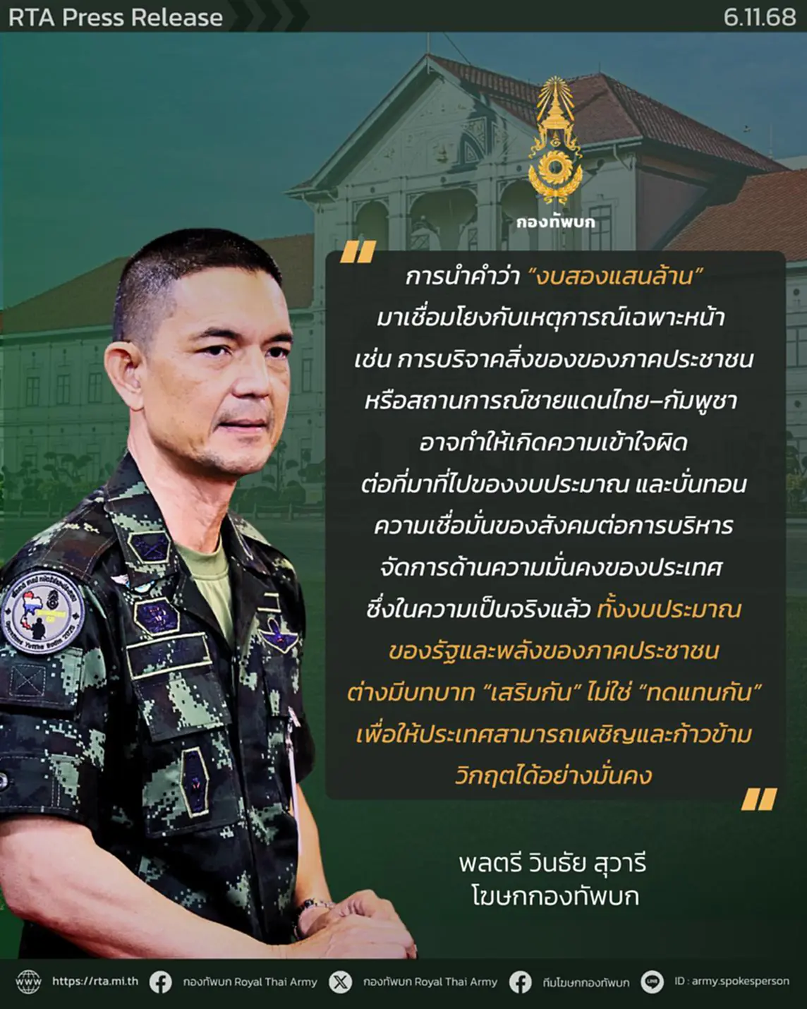 เมื่อวันที่ 6 พฤศจิกายน 2568 ที่กองบัญชาการกองทัพบก พลตรี วินธัย สุวารี โฆษกกองทัพบก กล่าวถึงกรณีที่ประชุมคณะกรรมาธิการการทหาร ได้หยิบยกประเด็นงบประมาณจำนวน 200,000 ล้านบาท ของกระทรวงกลาโหม มาเชื่อมโยงกับกรณีที่ภาคประชาชนได้ร่วมบริจาคสิ่งของเพื่อสนับสนุนการปฏิบัติงานและให้กำลังใจเจ้าหน้าที่ในช่วงสถานการณ์ชายแดนไทย–กัมพูชาที่ผ่านมา ซึ่งอาจทำให้สังคมเกิดความเข้าใจคลาดเคลื่อน โดยขออธิบายข้อเท็จจริงดังนี้