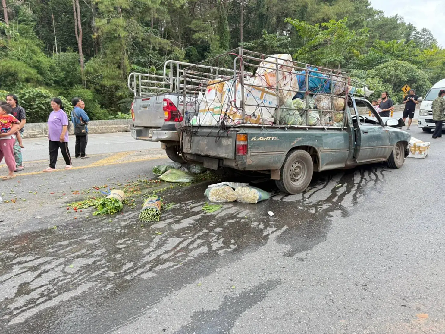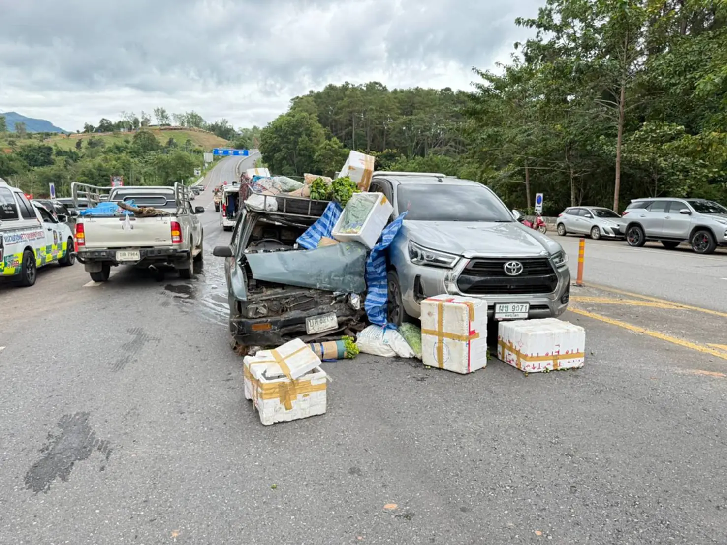 ที่เกิดเหตุพบรถกระบะ โตโยต้า ไฮลักซ์ รีโว่ สีบรอนซ์เงิน ทะเบียน กษ 9071 เพชรบูรณ์ ชนประสานงากับรถกระบะบรรทุกผัก อีซูซุ สีเขียวเข้ม ทะเบียน บต 6279 เพชรบูรณ์ สภาพด้านหน้าพังยับเยิน บนถนนมีผักสดและกล่องโฟมกระจายเกลื่อนเต็มพื้นถนน