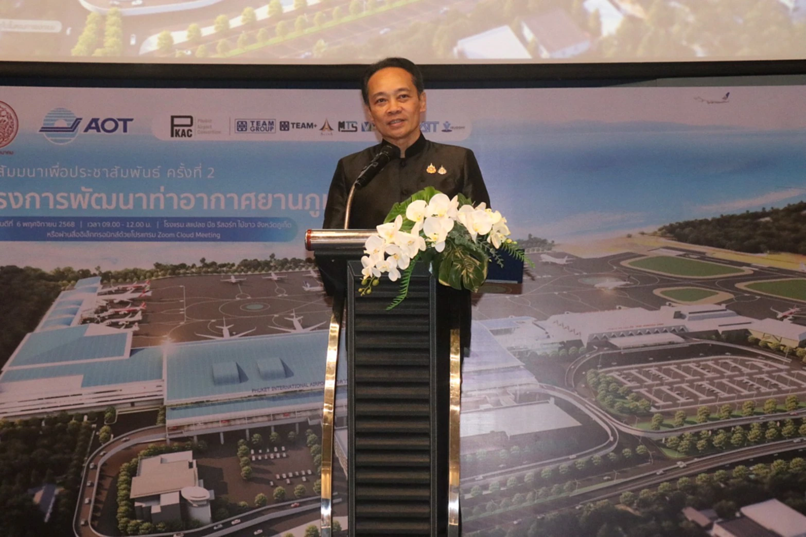 วันที่ 6 ต.ค. 2568 ที่ห้องประชุมทัวรัส โรงแรมสแปลช บีช รีสอร์ท ไม้ขาว จังหวัดภูเก็ต นายสมาวิษฎ์ สุพรรณไพ รองผู้ว่าราชการจังหวัดภูเก็ต เป็นประธานเปิดงานสัมมนาประชาสัมพันธ์ครั้งที่ 2 “โครงการพัฒนาท่าอากาศยานภูเก็ต ระยะที่ 2” โดยมีนายมนต์ชัย ตะโหนด ผู้อำนวยการท่าอากาศยานภูเก็ต นายทวนชัย ตันสุริยวงศ์ รองผู้อำนวยการฯ ภาครัฐ เอกชน และสื่อมวลชน เข้าร่วมรับฟัง ทั้งในรูปแบบออนไซต์และออนไลน์ ผ่านระบบ Zoom Cloud Meeting พร้อมร่วมเสวนาแลกเปลี่ยนความคิดเห็น เพื่อระดมข้อเสนอแนะในการพัฒนาโครงสร้างพื้นฐานของสนามบินให้สอดคล้องกับการเติบโตของจังหวัดภูเก็ตในอนาคต