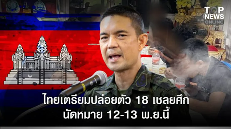 ล่าสุดวันนี้ ( 6 พ.ย.68 ) แหล่งข่าวฝ่ายความมั่นคงเปิดเผยกับทีมข่าวท็อปนิวส์ว่า ข่าวการเตรียมปล่อยตัวเชลยศึก กัมพูชา จำนวน 18 นายเป็นเรื่องจริง ซึ่งขณะนี้อยู่ระหว่างการตรวจสุขภาพของ 18 เฉลยศึกทั้ง 18 นายก่อนส่งตัว ส่วนจะปล่อยวันไหนนั้นยังไม่สามารถระบุวันเวลาที่แน่ชัดได้