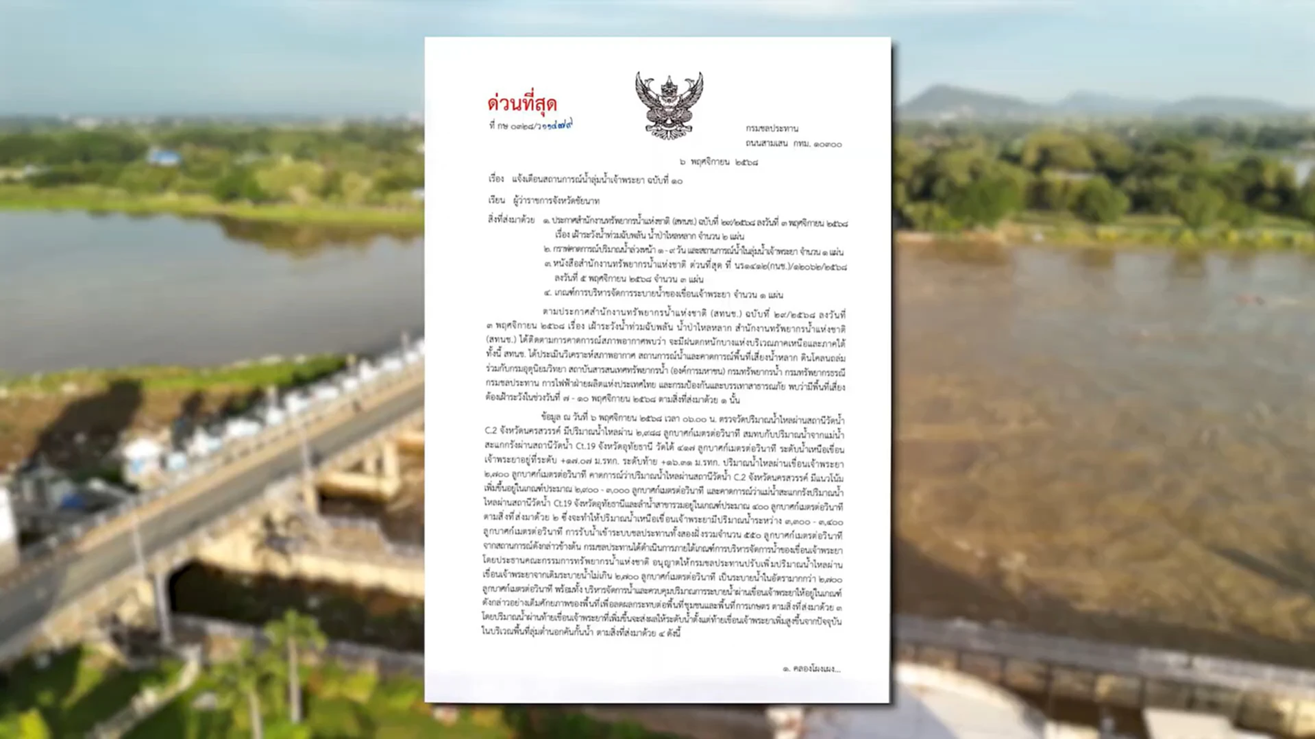 วันนี้ (7 พ.ย.2568 ) นายพงศธร ศิริอ่อน ผู้ทรงคุณวุฒิด้านวิศวกรรมโยธา รักษาราชการแทนรองอธิบดี ปฏิบัติราชการแทนอธิบดีกรมชลประทาน ออกประกาศแจ้งเตือนสถานการณ์น้ำลุ่มเจ้าพระยา ฉบับที่ 10 ถึงผู้ว่าราชการ 11 จังหวัดลุ่มน้ำเจ้าพระยา ประกอบด้วย จ.อุทัยธานี ชัยนาท สิงห์บุรี อ่างทอง สุพรรณบุรี พระนครศรีอยุธยา ลพบุรี ปทุมธานี นนทบุรี สมุทรปราการ และ กรุงเทพมหานครฯ