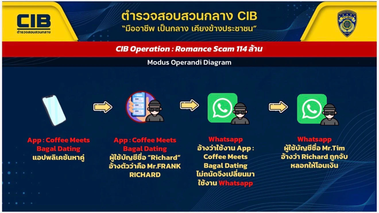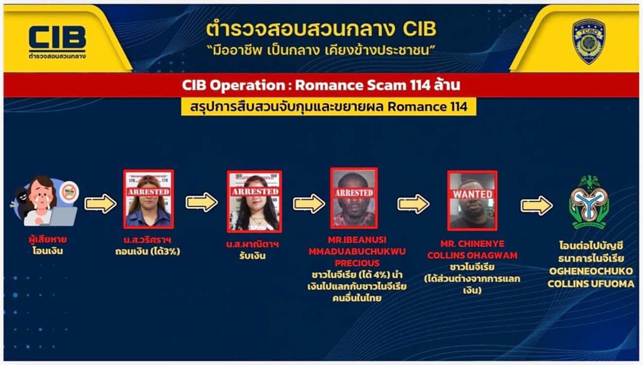 ตร.บช.ก.เปิดปฏิบัติการ “Romance 114” ทลายเครือข่ายโรแมนซ์สแกม จับกุมชาวไนจีเรีย พร้อมเครือข่ายคนไทยรวม 6 ราย หลังใช้โปรไฟล์ฝรั่งหน้าตาดีหลอกผู้เสียหายไปกว่า 114 ล้านบาท พร้อมยึดทรัพย์สินที่ได้จากการกระทำความผิดเพียบ