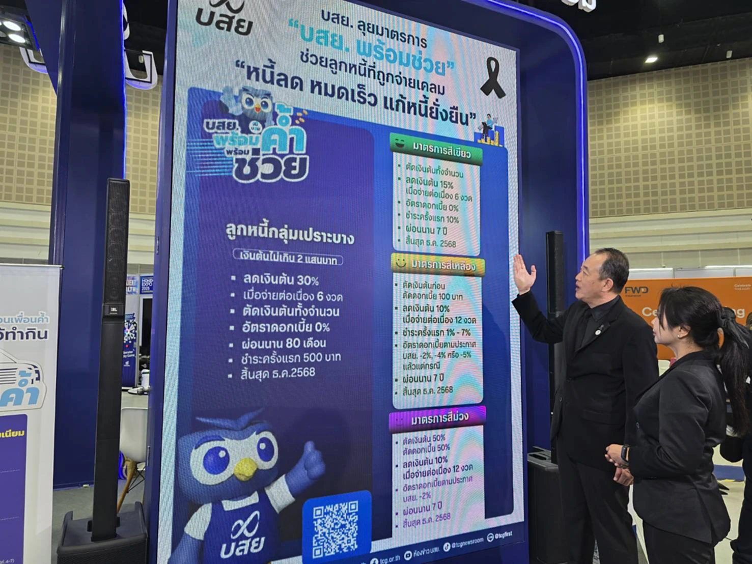 โดยผู้ประกอบการ SMEs ที่ต้องการซื้อรถกระบะเพื่อประกอบอาชีพ สามารถติดต่อที่โชว์รูมรถยนต์ใกล้บ้าน และยื่นขอสินเชื่อกับลีสซิ่ง และสถาบันการเงินที่ร่วมมาตรการ “กระบะพี่ มีคลังค้ำ” หรือ ลงทะเบียนเข้าร่วมมาตรการฯ ได้ที่ LINE OA : @tcgfirst ฟรี! ไม่มีค่าใช้จ่าย พร้อมกันนี้ ยังตอบสนองนโยบายภาครัฐในการแก้หนี้ โดยระดมทีมงานให้คำปรึกษาในการแก้หนี้ เพื่อช่วยเหลือลูกหนี้ที่ บสย. จ่ายเคลม เปิดบูธชวนลูกหนี้มาปรับโครงสร้างหนี้ และปลดหนี้ ที่บูธ บสย. ผ่านมาตรการ “บสย. พร้อมช่วย” ภายใต้คอนเซ็ปต์ “เปิดใจ ปิดหนี้ “ จุดเด่นคือ ยืดหนี้ยาวสูงสุด 7 ปี ช่วย SMEs “ผ่อนน้อย เบาแรง” “ตัดเงินต้น ก่อนตัดดอก” ดอกเบี้ย 0% ช่วยให้ลูกหนี้อยู่รอด อยู่ได้ และกลับไปเป็นลูกหนี้ปกติได้ง่ายขึ้น พิเศษ! สำหรับลูกหนี้ที่เข้ามา “ปลดหนี้” ในงานนี้ รับโปรโมชัน “ลดต้นสูงถึง 30%” พร้อม “ปลดดอก” เพื่อต่อลมหายใจให้ SMEs สามารถกลับมาเดินหน้าต่อได้