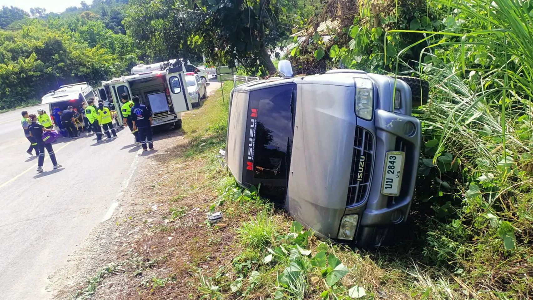 หนุ่มใหญ่ขับกระบะพาญาติ เข้าเมือง ขากลับรถเครื่องดับ เบรกไม่ทำงาน พลิกคว่ำ เจ็บ 9 ราย