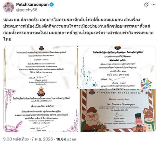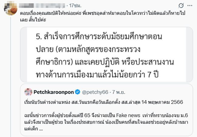 หลังจากนายกรุณพล เทียนสุวรรณ สส.บัญชีรายชื่อ และรองโฆษกพรรคประชาชน ออกมาโพสต์ชี้แจงกรณี นายปารเมศ วิทยารักษ์สรรค์ สส.กทม.พรรคประชาชน ตั้งนายคณิศร ฉมังวิภา เป็นผู้ช่วยดำเนินการประจำตัว ซึ่งถูกตั้งคำถามว่าคุณสมบัติครบถ้วนหรือไม่ โดยยืนยันเด็ก จบ ม.6 แล้วจึงมาเป็นผู้ช่วย ในเรื่องประสบการณ์ น้องเป็นคนที่สนใจและช่วยอยู่หลังบ้านมาแต่เด็ก