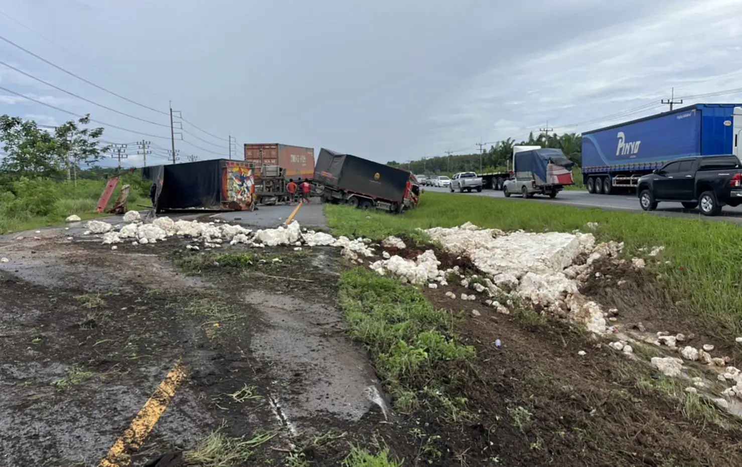 เมื่อถึงที่เกิดเหตุพบรถบรรทุกพ่วง 22 ล้อ สภาพตัวรถตกร่องกลางถนน ห่างไปเล็กน้อยพบพ่วงท้ายพลิกตะแคงขวางถนน เทกระจาดขี้ยางก้อนถ้วยเกลื่อนถนน ส่วนคนขับบาดเจ็บเล็กน้อย จึงนำส่งโรงพยาบาลทุ่งใหญ่ แพทย์ช่วยเหลืออาการปลอดภัยแล้ว