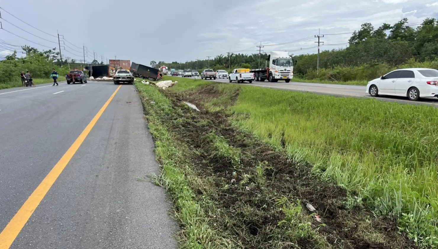 วันที่ 8 พ.ศ. 2568 เจ้าหน้าที่ตำรวจ สภ.ทุ่งใหญ่ จ.นครศรีธรรมราช รับแจ้งอุบัติเหตุรถบรรทุกพ่วง 18 ล้อ เสียหลักตกร่องกลางถนน คนขับบาดเจ็บเล็กน้อย บนถนนสายเอเชี 41 ขาล่องใต้ ต.ปริก อ.ทุ่งใหญ่ จึงพร้อมด้วยเจ้าหน้าที่กู้ภัยใต้เต็กตึ๊ง จึงรีบเดินทางไปตรวจสอบ