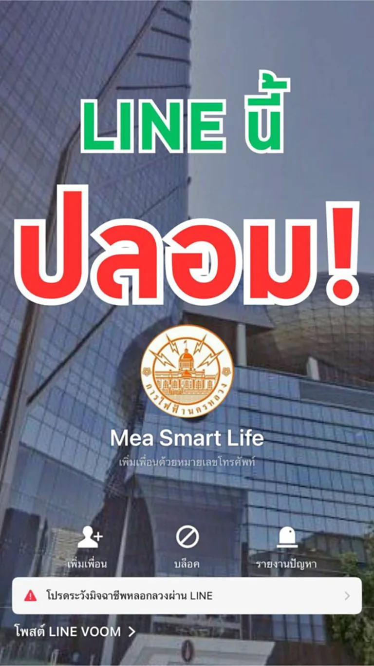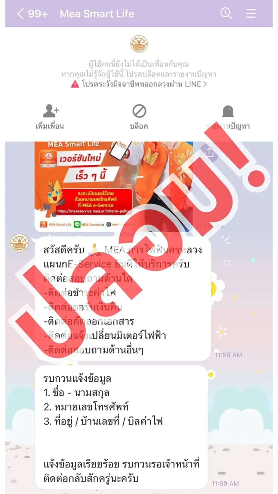 วันนี้ (8 พฤศจิกายน 2568) นายคมกริช สาคริก ผู้อำนวยการฝ่ายสื่อสารองค์กร MEA หรือ การไฟฟ้านครหลวง เปิดเผยว่า MEA ตรวจพบกลุ่มมิจฉาชีพแอบอ้างเป็นเจ้าหน้าที่ MEA และสร้าง LINE Official Account ปลอม (เช่น ใช้ชื่อเลียนแบบ “Mea Smart Life”) เพื่อหลอกลวงประชาชน โดยพฤติกรรมของมิจฉาชีพคือการหลอกให้เพิ่มเพื่อน เสนอบริการด้านไฟฟ้า หรือขอข้อมูลส่วนตัว เช่น ชื่อ-นามสกุล หมายเลขโทรศัพท์ ที่อยู่ หรือข้อมูลทางการเงิน และหลอกลวงให้ชำระค่าบริการหรือค่าธรรมเนียมต่าง ๆ ผ่านบัญชีส่วนบุคคล โดยข้อมูลบัญชีปลอมที่ตรวจพบ จะใช้ LINE ID: mea13522 และโทรศัพท์แอบอ้าง: 0949303625, 0990966787