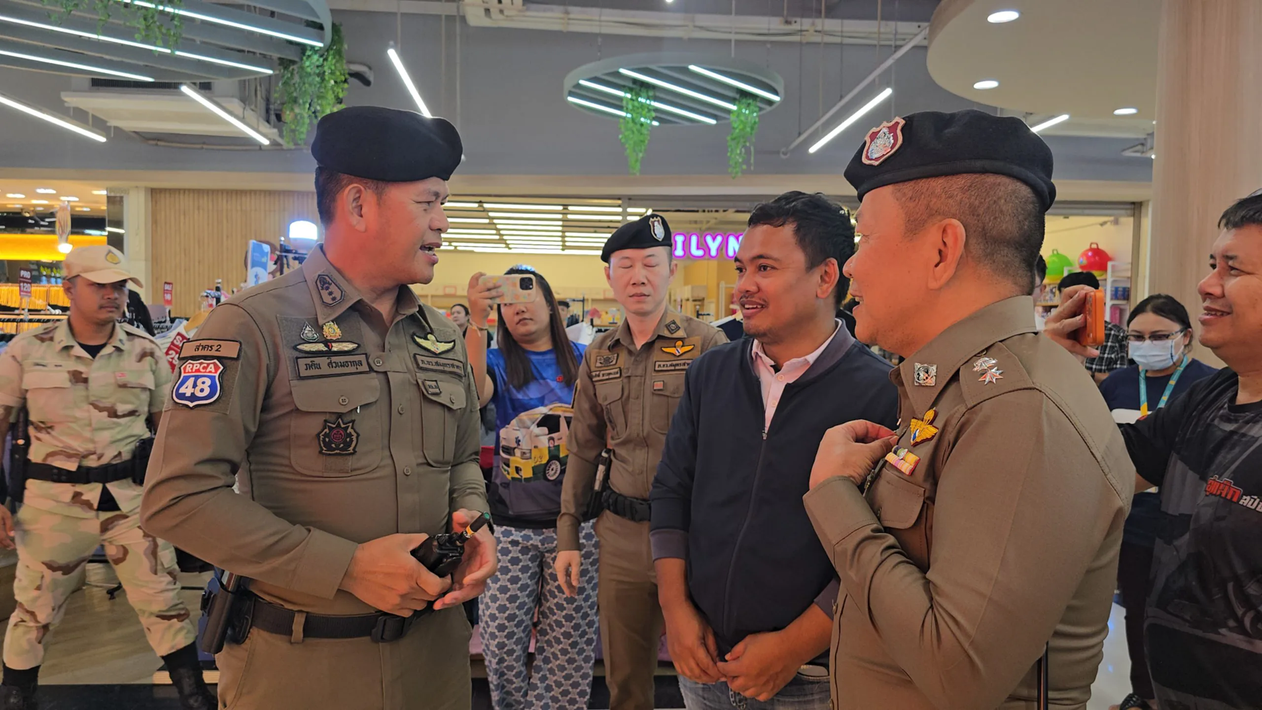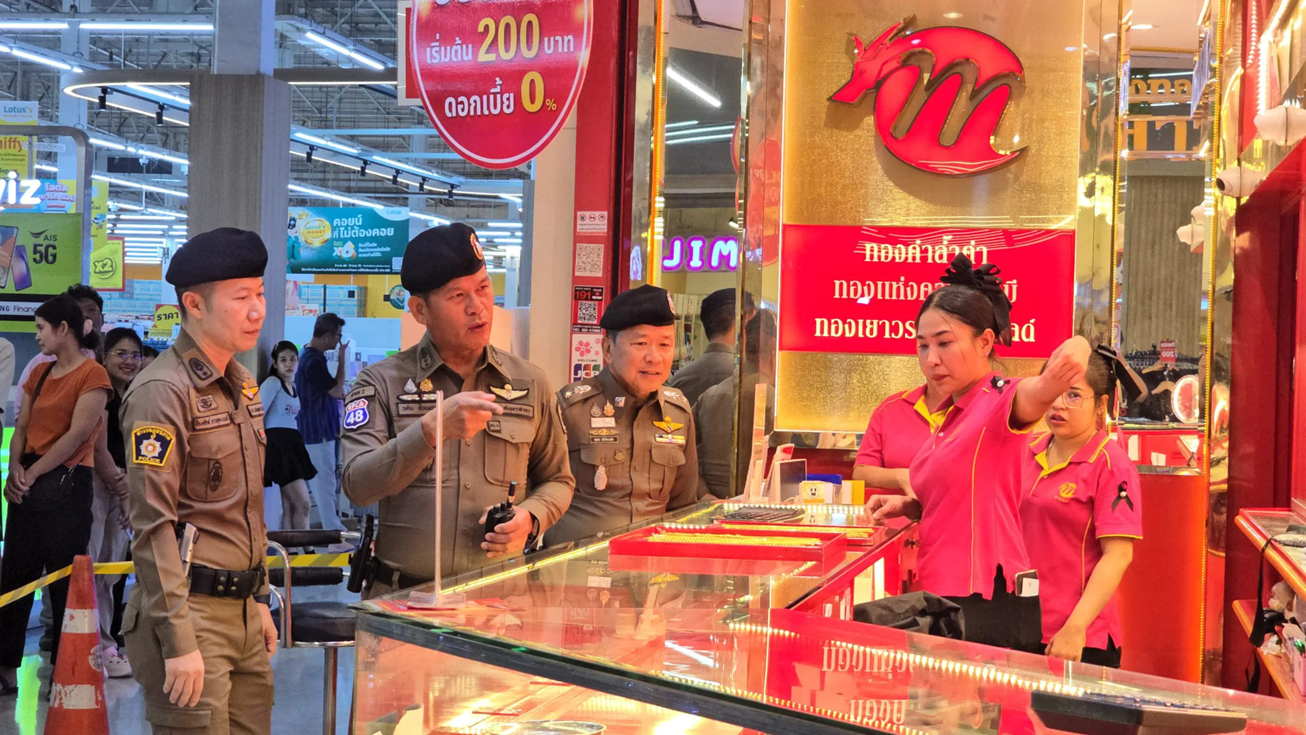 เมื่อเวลาประมาณ 15.30 น.ของวันที่ 09 พฤศจิกายน 2568 ศูนย์วิทยุสถานีตำรวจภูธรกระทุ่มแบน รับแจ้งมีเหตุปล้นทรัพย์ ที่ห้างทองเยาวราช เอ็มโกลด์ ภายในห้างสรรพสินค้าโลตัส กระทุ่มแบน จ.สมุทรสาคร จึงรีบรายงานให้ผู้บังคับบัญชาทราบ โดยทาง พล.ต.ต.ธีรเดช อธิภัคคกุล ผบก.ภ.จว.สมุทรสาคร ได้มอบหมายสั่งการให้ พ.ต.อ.ภคิณ ศิวเมธากุล รอง ผบก.ภ.จว.สมุทรสาคร รรท.ผกก.สภ.กระทุ่มแบน พร้อมด้วย พ.ต.ท.ชุมพล ฉัตร์สงวนชัย รอง ผกก.ป.สภ.กระทุ่มแบน พ.ต.ท.ศักดิ์สิทธิ์ ชูบุญเรือง รอง ผกก.สส.สภ.กระทุ่มแบน เจ้าหน้าที่ตำรวจชุดสืบสวน – ปราบปราม และเจ้าหน้าที่ตำรวจสายตรวจ เข้าตรวจสอบที่เกิดเหตุ ซึ่งเบื้องต้นมีรายงานว่า ภายหลังจากที่คนร้ายลงมือก่อเหตุปล้นทองแล้ว แต่ยังไม่ทันได้หนีออกห้างโลตัส ก็ถูกเจ้าหน้าที่ตำรวจสายสืบฯ
