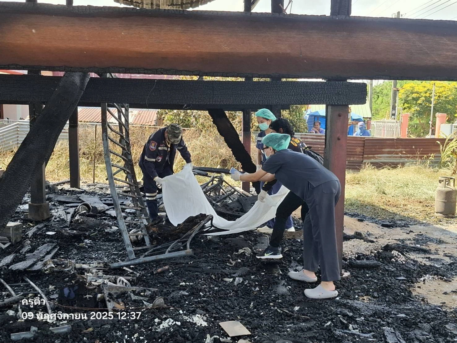 จากการตรวจสอบภายในบ้านไม้ยกพื้นใต้ถุน ที่ถูกไฟไหม้หนักเหลือแต่โครงเสาและหลังคา ทรัพย์สินทั้งหมดถูกไฟไหม้จนเสียหาย โดยบริเวณพื้นด้านล่างมีเตียงนอนและร่างของผู้เสียชีวิต 1 ราย ทราบชื่อ “นายบุญมี แซ่ตัน” อายุ 73 ปี (เจ้าของบ้าน) สภาพร่างไหม้ดำเกรียมเกือบหมดทั้งตัว โดยเจ้าหน้าที่ตำรวจและแพทย์เวร รพ.ปางศิลาทอง ได้เข้าชันสูตรพลิกศพของผู้เสียชีวิต ก่อนจะให้เจ้าหน้าที่กู้ภัยนำร่างส่งพิสูจน์สาเหตุการเสียชีวิตอย่างละเอียดอีกครั้งที่ รพ.ปางศิลาทอง
