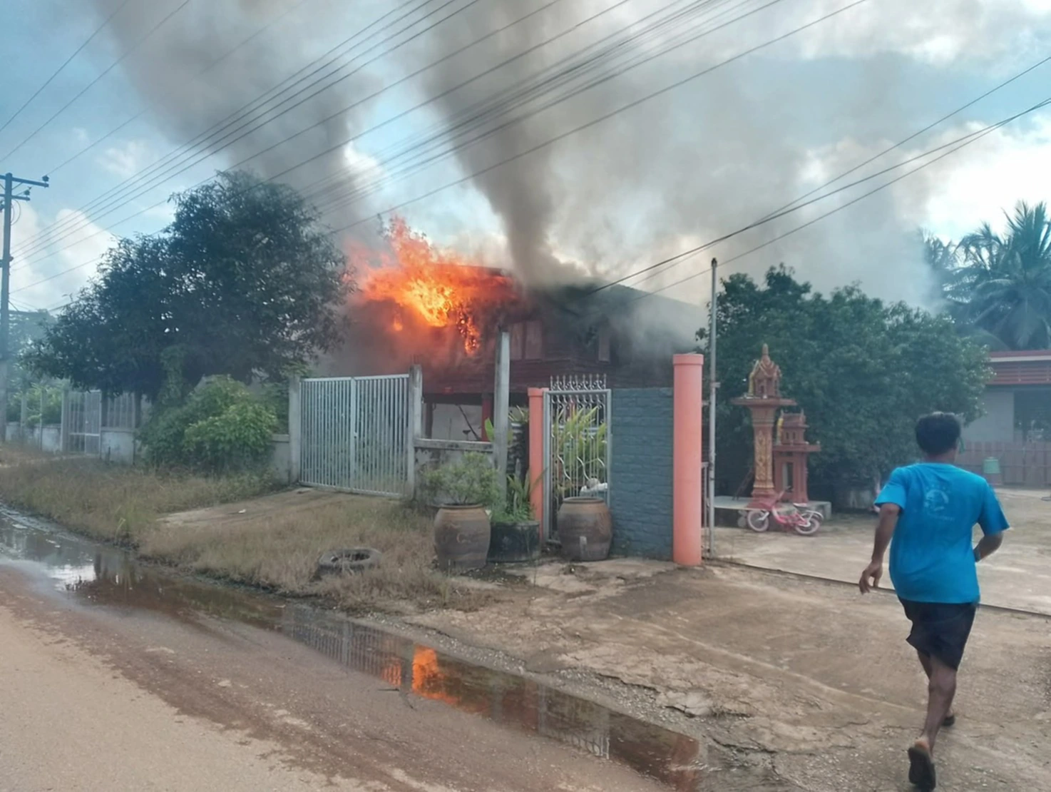 ขณะที่ กล้องวงจรปิดของบ้านติดกันได้จับภาพวินาทีเพลิงกำลังลุกไหม้และชาวบ้านได้ช่วยกันดับไฟแต่ก็ไม่สามารถควบคุมเพลิงได้ จน จนท.ดับเพลิงนำรถน้ำมาช่วยสกัดแต่ก็ไหม้วอดบ้านไม้ยกสูงไปเกือบทั้งหลังแล้ว ส่วนบ้านปูนหลังติดกันมีข้าวของเสียหายจำนวนมากแต่ไม่ได้ลุกลามทั้งหลัง หากไม่สามารถควบคุมเพลิงได้อาจลุกลามไปยังบ้านติดกัน โดยหลานชายของผู้ตายได้เดินพาไปดูจุดเกิดเหตุซึ่งผู้ตายได้ใช้น้ำมันราดก่อนที่จะจุดไฟเผาบ้านทั้ง 2 หลัง