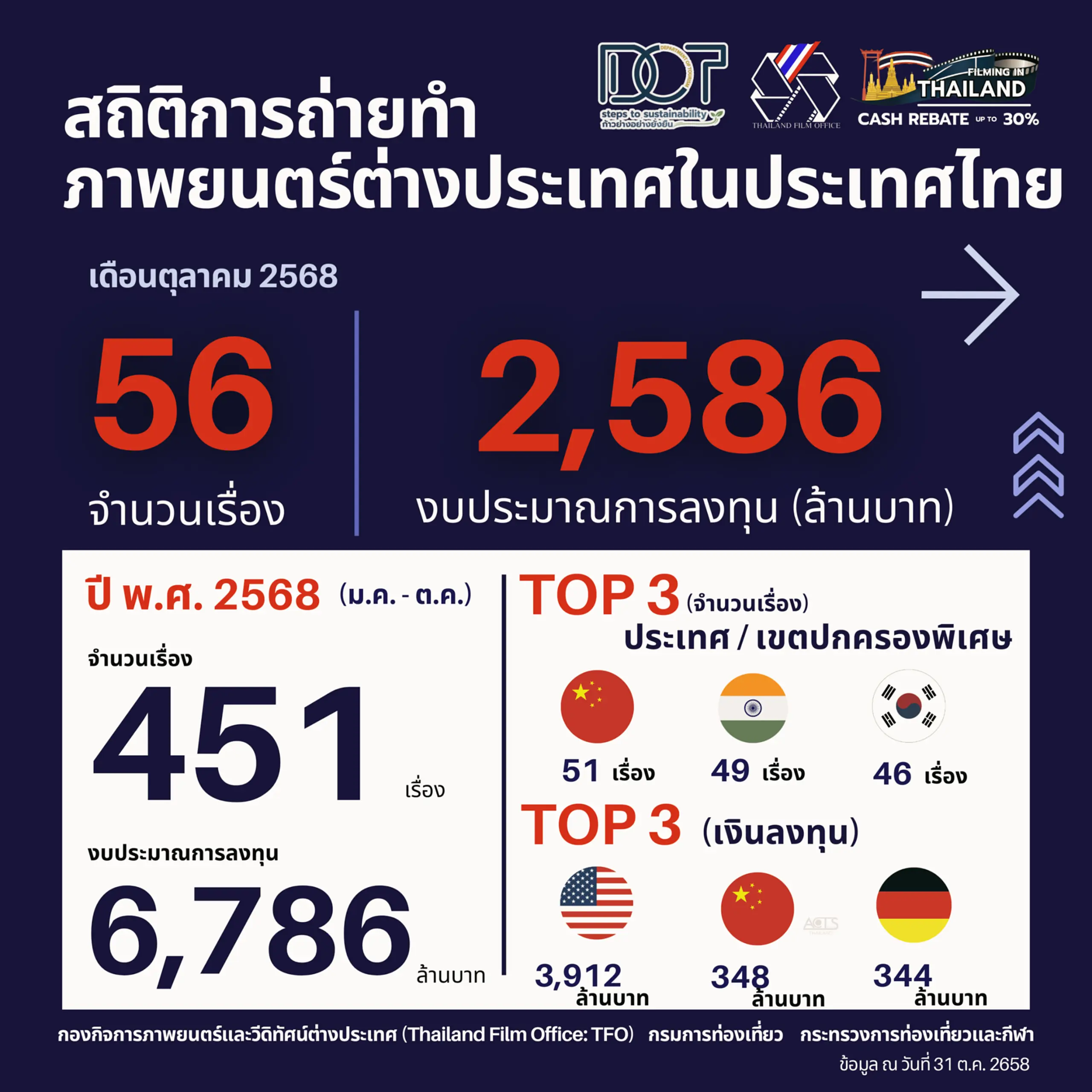 ส่วนภาพรวมตั้งแต่เดือนมกราคม – ตุลาคม 2568 มีกองถ่ายทำภาพยนตร์ต่างประเทศเข้ามาถ่ายทำในประเทศไทยแล้ว รวม 451 เรื่อง สร้างรายได้จากการใช้จ่ายในการถ่ายทำรวมกว่า 6,786 ล้านบาท สะท้อนให้เห็นถึงความเชื่อมั่นของผู้สร้างภาพยนตร์นานาชาติที่มีต่อศักยภาพของประเทศไทย หากพิจารณาตามจำนวนกองถ่ายในปี 2568 (มกราคม–ตุลาคม) พบว่า ประเทศที่เข้ามาถ่ายทำในประเทศไทยมากที่สุด 3 อันดับแรก ได้แก่ สาธารณรัฐประชาชนจีน จำนวน 51 เรื่อง สาธารณรัฐอินเดีย จำนวน 49 เรื่อง และสาธารณรัฐเกาหลี จำนวน 46 เรื่อง ตามลำดับขณะที่ในด้านมูลค่าการลงทุนสูงสุด 3 อันดับแรก ได้แก่ สหรัฐอเมริกา มูลค่าการลงทุนกว่า 3,912 ล้านบาท สาธารณรัฐประชาชนจีน มูลค่าการลงทุนกว่า 348 ล้านบาท และสหพันธ์สาธารณรัฐเยอรมนี มูลค่าการลงทุนกว่า 344 ล้านบาท