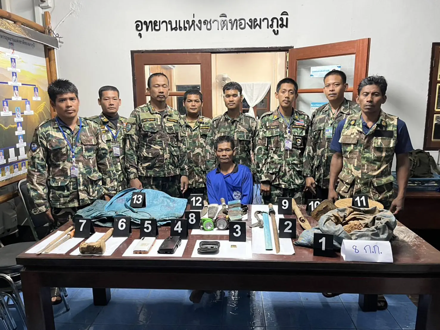 ​ผลการจับกุมพบ นายโซเอะเกดุ (ไม่มีนามสกุล) อายุ 34 ปี สัญชาติพม่า จากหมู่บ้านยาพู ประเทศเมียนมา แอบหลบอยู่ในหลุมขุดดิน พร้อมยึดของกลาง 13 รายการ ได้แก่ กระสอบดิน 8 กิโลกรัม, มีดดาบ, กระสุนปืน .22 LR จำนวน 5 นัด, โทรศัพท์มือถือ 2 เครื่อง, อุปกรณ์ขุดดินและร่อนแร่ รวมมูลค่าความเสียหาย 756,307 บาท ทั้งนี้ ผู้ต้องหาให้การว่าเดินทางเข้าเมืองไทยผ่านช่องทางธรรมชาติช่องป่าหมาก-ยาพู พร้อมเพื่อนอีก 3 คน โดยถูกชักชวนให้มาขุดดินหาแร่ทองคำ