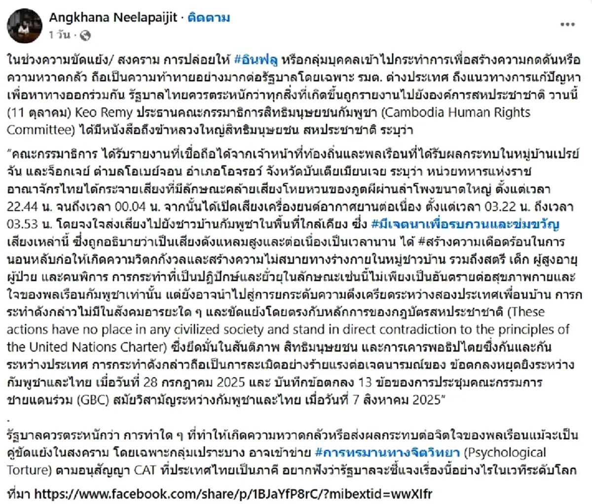 เมื่อวันที่ 11 พฤศจิกายน 2568 นางอังคณา นีละไพจิตร สมาชิกวุฒิสภา (สว.) โพสต์ข้อความผ่านเฟซบุ๊กส่วนตัว Angkhana Neelapaijit  ระบุว่า…การลักลอบรื้อลวดหนามเพื่อเข้ามาฝังทุ่นระเบิดใหม่ถือเป็นการผิดข้อตกลง #ปฏิญญาร่วม 26 ตุลา และขัด #อนุสัญญาออตนาวา