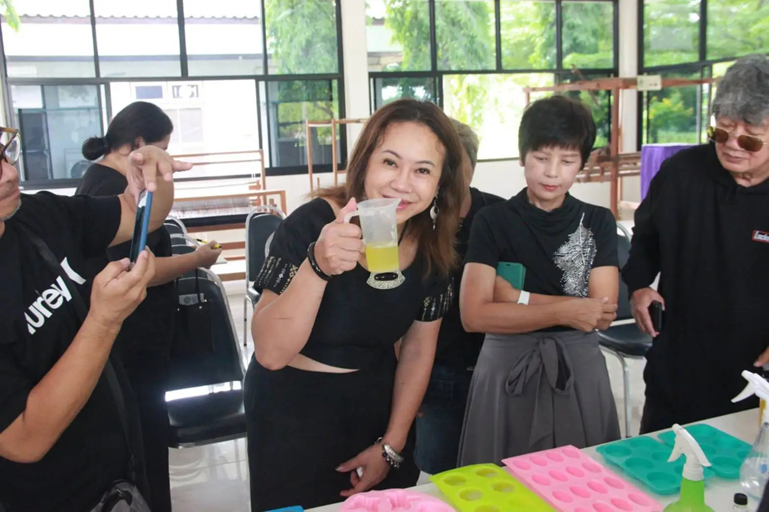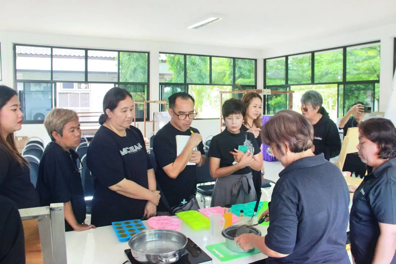 ในการนี้นายประยุทธ์ จันทร์เหม ผู้อำนวยการศูนย์หม่อนไหมเฉลิมพระเกียรติฯ กาญจนบุรี ได้มอบหมายให้นางสาวสมหญิง ทับทิมศรี นักวิชาการเกษตรชำนาญการ พร้อมด้วยเจ้าหน้าที่ศูนย์ฯ ต้อนคณะสมาคมการค้า การท่องเที่ยวเชิงสุขภาพ กาญจนบุรี เข้าศึกษาดูงานภายในศูนย์ฯ และร่วมกิจกรรม Work Shop การทำสบู่รังไหม เพื่อเรียนรู้กระบวนการผลิตและการพัฒนาผลิตภัณฑ์จากรังไหมแลกเปลี่ยนความรู้ ด้านการแปรรูป วัตถุดิบธรรมชาติสู่ผลิตภัณฑ์สุขภาพและความงาม