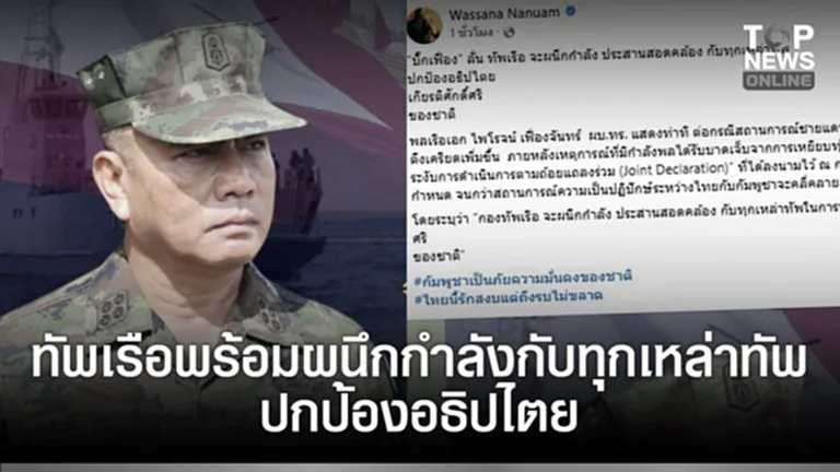 วันที่ 11 พ.ย.2568 วาสนา นาน่วม ผู้สื่อข่าวสายทหาร ออกมาโพสต์ข้อความระบุว่า“บิ๊กเฟื่อง“ ลั่น ทัพเรือ จะผนึกกำลัง ประสานสอดคล้อง กับทุกเหล่าทัพปกป้องอธิปไตย เกียรติศักดิ์ศรี ของชาติ พลเรือเอก ไพโรจน์ เฟื่องจันทร์ ผบ.ทร. แสดงท่าที ต่อกรณีสถานการณ์ชายแดนไทย–กัมพูชาที่มีความตึงเครียดเพิ่มขึ้น ภายหลังเหตุการณ์ที่มีกำลังพลได้รับบาดเจ็บจากการเหยียบทุ่นระเบิด และ สมช. มีมติ ให้ ระงับการดำเนินการตามถ้อยแถลงร่วม (Joint Declaration)” ที่ได้ลงนามไว้ ณ กรุงกัวลาลัมเปอร์
