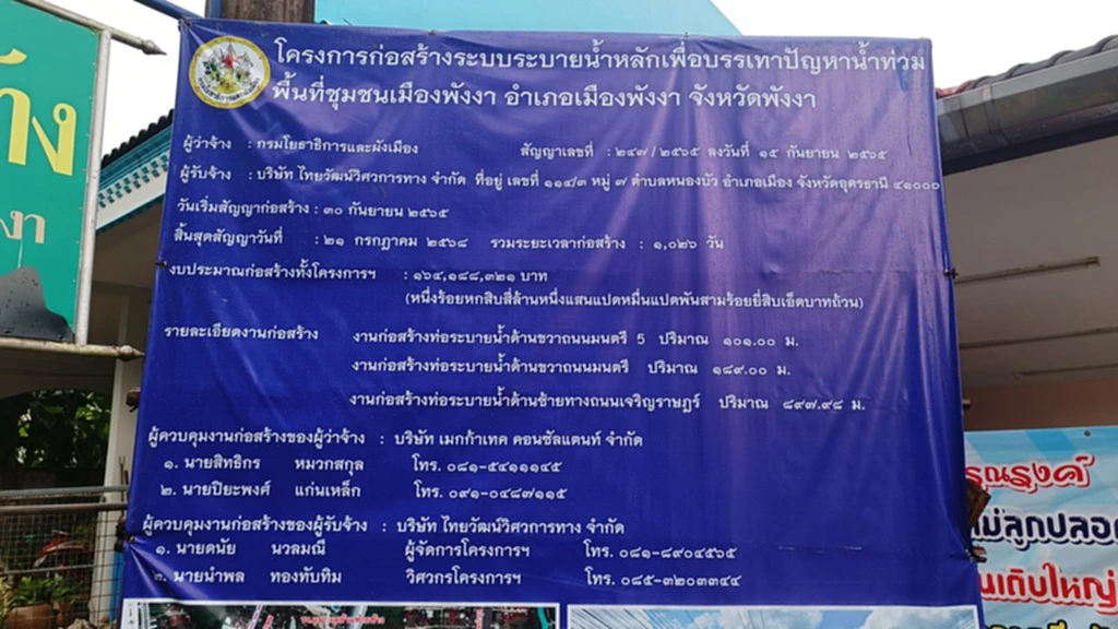ผู้สื่อข่าวตรวจสอบพบว่า โครงการดังกล่าวมีชื่อว่า “โครงการก่อสร้างระบบระบายน้ำหลักเพื่อบรรเทาปัญหาน้ำท่วมพื้นที่ชุมชนเมืองพังงา อำเภอเมืองพังงา” โดยกรมโยธาธิการและผังเมืองเป็นผู้ว่าจ้าง มูลค่าโครงการกว่า 179 ล้านบาท เริ่มสัญญาเมื่อวันที่ 30 ก.ย. 2565 สิ้นสุดวันที่ 18 ต.ค. 2567 ระยะเวลาดำเนินการ 750 วัน ก่อนมีการแก้ไขสัญญาครั้งที่ 1 ขยายเวลาออกไปถึงวันที่ 21 ก.ค. 2568 รวมระยะเวลาก่อสร้าง 1,026 วัน งบประมาณปรับเหลือ 164,188,321 บาท ขณะที่ชาวบ้านยังคงรอให้โครงการแล้วเสร็จ เพื่อคืนความสะดวกและภาพลักษณ์ที่ดีให้เมืองพังงาโดยเร็วที่สุด.