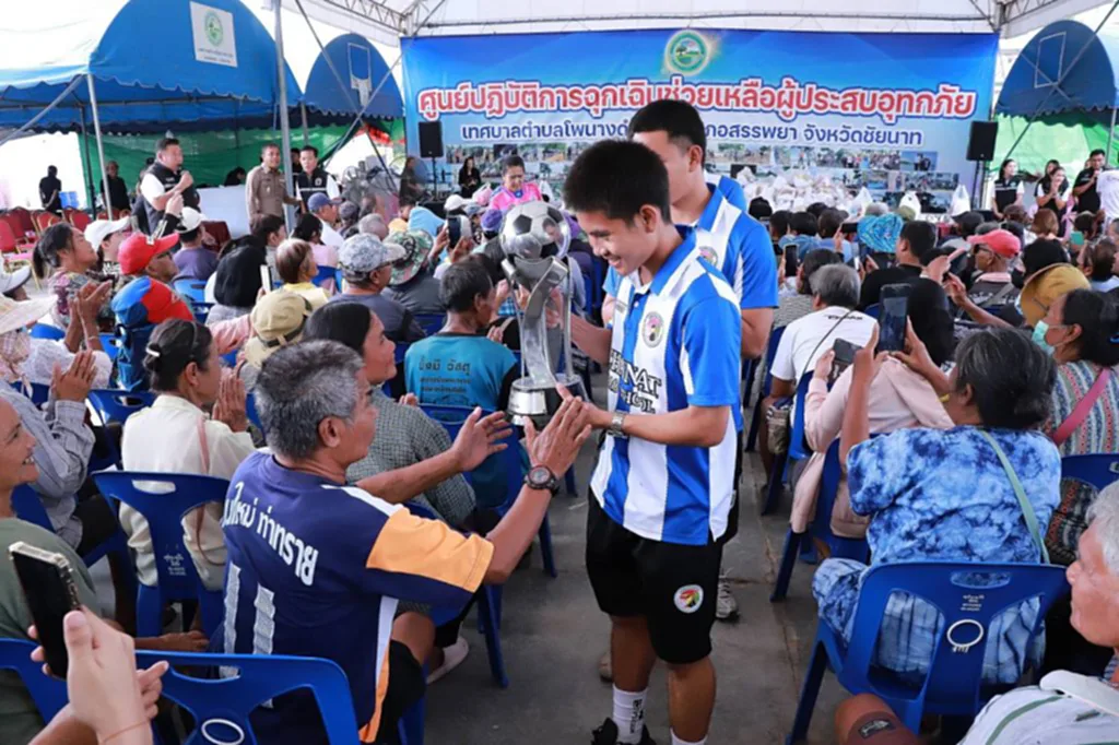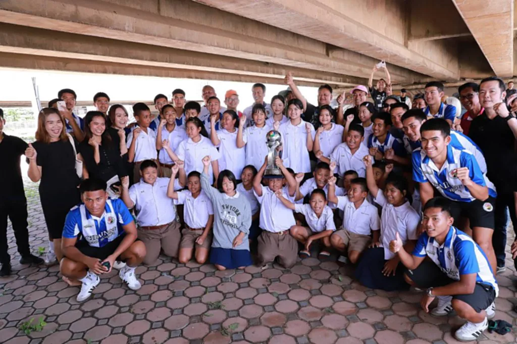 พร้อมกันนี้ทีมฟุตบอลได้นำถ้วยไปให้น้องๆและผู้ประสบภัยได้ชื่นชมเพื่อเป็นกำลังใจและเป็นแรงบันดาลใจของน้องๆรุ่นต่อไป
