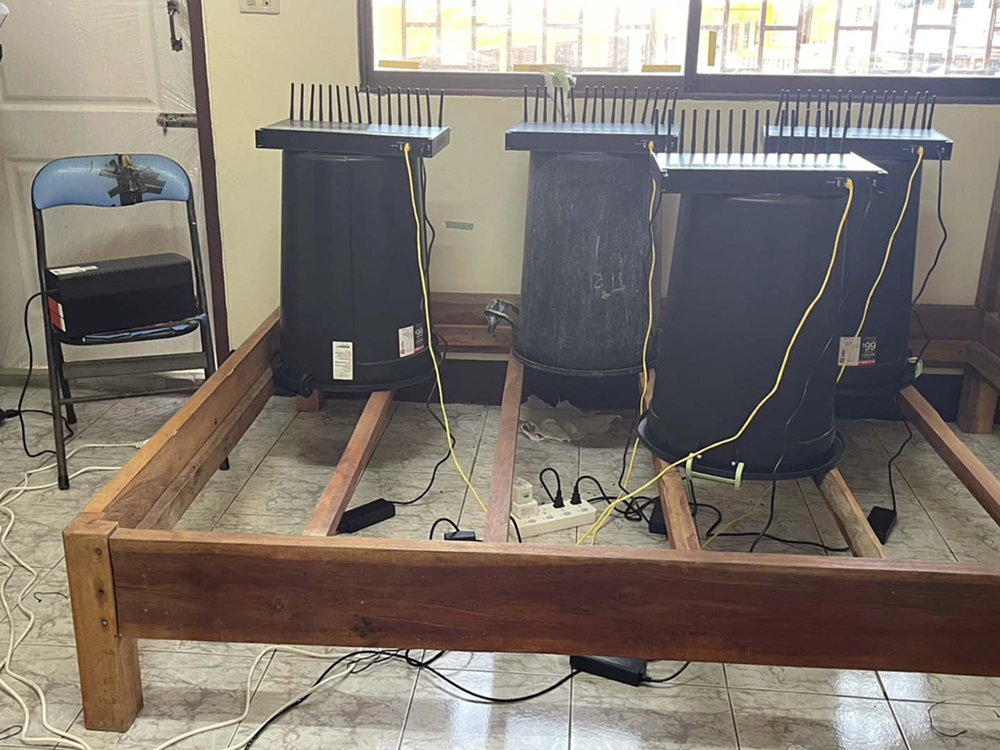 จากการตรวจค้นอาคารพาณิชย์ บริเวณชั้น 2  ภายในสถานีขนส่งผู้โดยสารจังหวัดมุกดาหาร เจ้าหน้าที่พบเครื่องซิมบ็อกซ์จำนวน 4 เครื่อง วางอยู่บนถังน้ำพลาสติกสีดำซึ่งตั้งอยู่บนโครงไม้เตียงนอน อุปกรณ์ดังกล่าวสามารถบรรจุซิมการ์ดได้ถึงเครื่องละ 32 ซิม ใช้สำหรับแปลงสัญญาณโทรศัพท์ให้สามารถโทรผ่านอินเทอร์เน็ตได้โดยไม่ผ่านระบบของผู้ให้บริการหลัก ซึ่งเป็นเทคนิคที่แก๊งคอลเซ็นเตอร์มักใช้ในการปกปิดแหล่งต้นทางของการโทรหลอกลวง