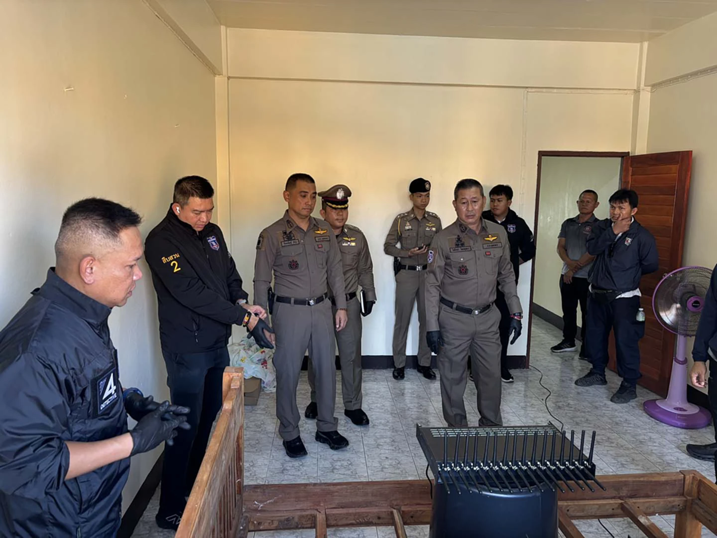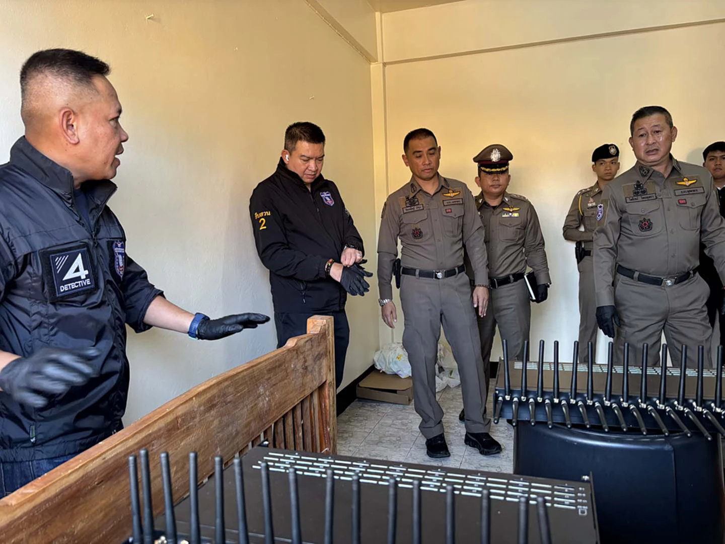 วันที่ 11 พ.ย. 2568 ภายใต้การอำนวยการของ พล.ต.ท.สันติ ชัยนิรามัย ผู้บัญชาการตำรวจภูธรภาค 4, พล.ต.ต.นพเก้า โสมนัส รองผู้บัญชาการตำรวจภูธรภาค 4 และ พล.ต.ต.ภูมิพัฒน์ ภัทรศรีวงษ์ชัย ผู้บังคับการสืบสวนตำรวจภูธรภาค 4 ได้สั่งการให้ พ.ต.อ.ชาญณรงค์ มากพิสุทธิ์ รองผู้บังคับการสืบสวนตำรวจภูธรภาค 4 และ พ.ต.อ.นุติ ศักดิ์สุภาพ ผู้กำกับการสืบสวน 2 กองบังคับการสืบสวน ภ.4 สนธิกำลังร่วมกับ พล.ต.ต.ไพโรจน์ ไทยพุทรา ผู้บังคับการตำรวจภูธรจังหวัดมุกดาหาร, พ.ต.อ.กิตเตชิษฐ์ บำรุง รองผู้บังคับการตำรวจภูธรจังหวัดมุกดาหาร และ พ.ต.อ.วิจิตร บุญวรรณ ผู้กำกับการสืบสวนตำรวจภูธรจังหวัดมุกดาหาร พ.ต.อ.ประยุทธ์ เรือนทองคำ ผกก.สภ.เมืองมุกดาหาร พร้อมด้วยนายชยพัทธ์ มะแม้น. ผู้อำนวยการสำนักงาน กสทช. เขต 25 ร่วมกันตรวจสอบอาคารพาณิชย์ ภายในสถานีขนส่งผู้โดยสารจังหวัดมุกดาหาร เลขที่ 33/127 ถนนชยางกูร อำเภอเมือง จังหวัดมุกดาหาร หลังได้รับรายงานว่าเป็นจุดติดตั้งอุปกรณ์ “ซิมบ็อกซ์ (Simbox)” ของเครือข่ายแก๊งคอลเซ็นเตอร์