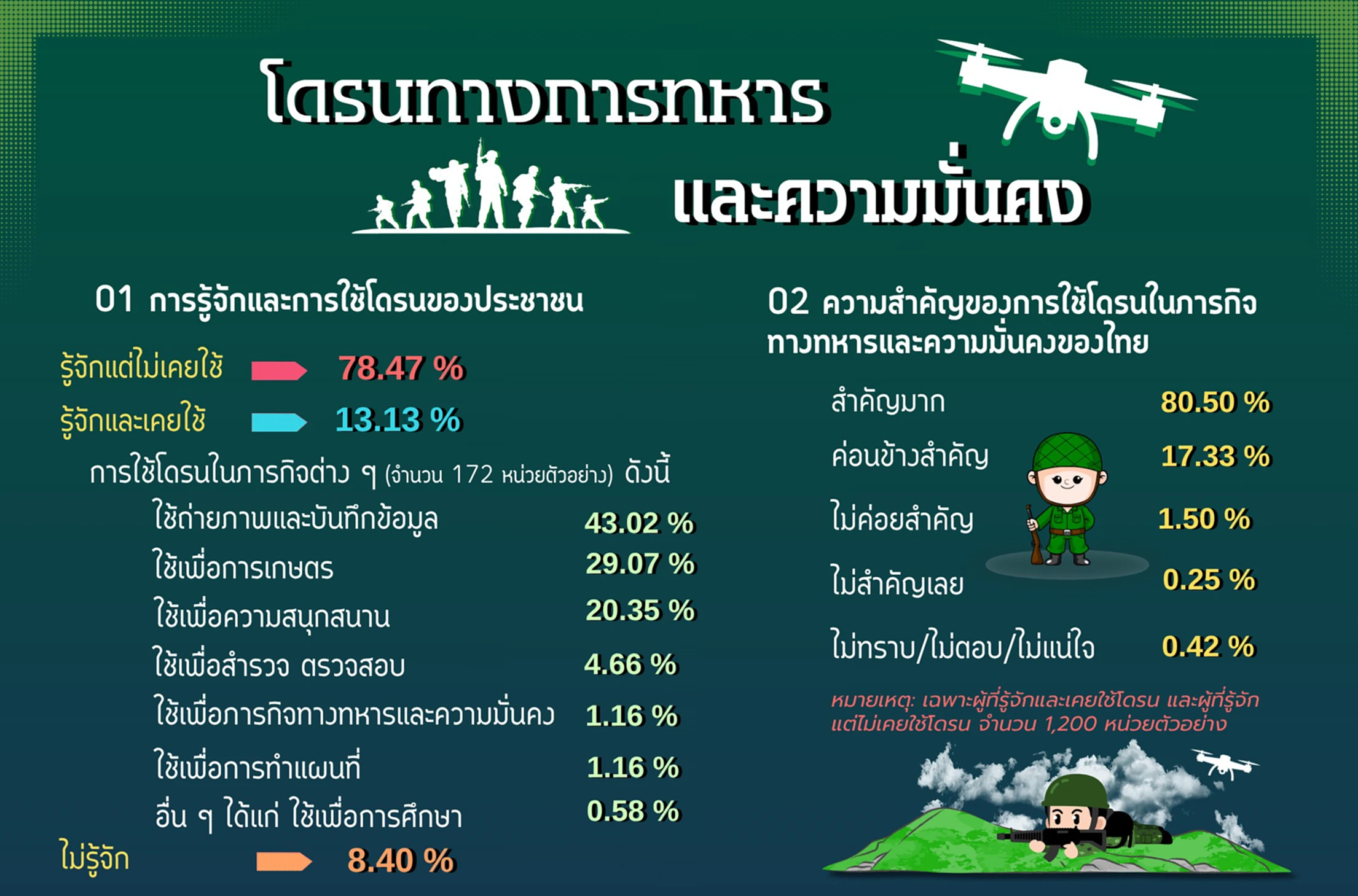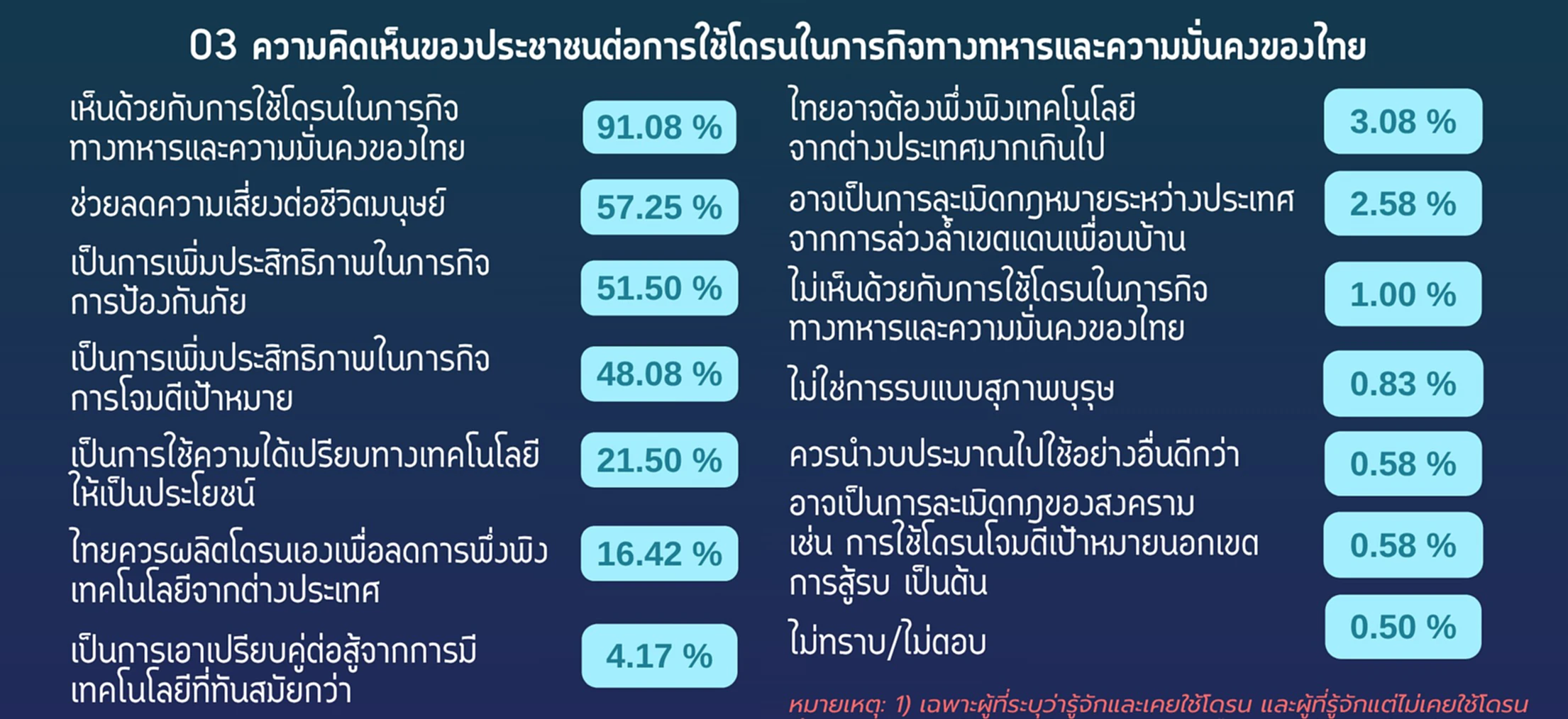 ความคิดเห็นของประชาชนต่อการใช้โดรนในภารกิจทางทหารและความมั่นคงของไทย พบว่า ตัวอย่าง 91.08% ระบุว่า เห็นด้วยกับการใช้โดรนในภารกิจทางทหารและความมั่นคงของไทย รองลงมา 57.25% ระบุว่า ช่วยลดความเสี่ยงต่อชีวิตมนุษย์ 51.50% ระบุว่า เป็นการเพิ่มประสิทธิภาพในภารกิจการป้องกันภัย 48.08% ระบุว่า เป็นการเพิ่มประสิทธิภาพในภารกิจการโจมตีเป้าหมาย 21.50% ระบุว่า เป็นการใช้ความได้เปรียบทางเทคโนโลยีให้เป็นประโยชน์ 16.42% ระบุว่า ไทยควรผลิตโดรนเองเพื่อลดการพึ่งพิงเทคโนโลยีจากต่างประเทศ 4.17% ระบุว่า เป็นการเอาเปรียบคู่ต่อสู้จากการมีเทคโนโลยีที่ทันสมัยกว่า 3.08% ระบุว่า ไทยอาจต้องพึ่งพิงเทคโนโลยีจากต่างประเทศมากเกินไป 2.58% ระบุว่า อาจเป็นการละเมิดกฎหมายระหว่างประเทศจากการล่วงล้ำเขตแดนเพื่อนบ้าน 1% ระบุว่า ไม่เห็นด้วยกับการใช้โดรนในภารกิจทางทหารและความมั่นคงของไทย 0.83% ระบุว่า ไม่ใช่การรบแบบสุภาพบุรุษ 0.58% ระบุว่า ควรนำงบประมาณไปใช้อย่างอื่นดีกว่า และอาจเป็นการละเมิดกฎของสงคราม เช่น การใช้โดรนโจมตีเป้าหมายนอกเขตการสู้รบ เป็นต้น ในสัดส่วนที่เท่ากัน และ 0.50% ระบุว่า ไม่ทราบ/ไม่ตอบ