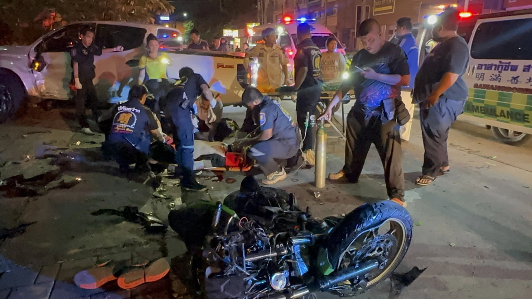 ระทึกกลางดึก! กระบะมักง่ายกลับรถในที่ห้าม บิ๊กไบค์หนุ่มพุ่งชนสนั่น ร่างกระเด็นเจ็บสาหัส