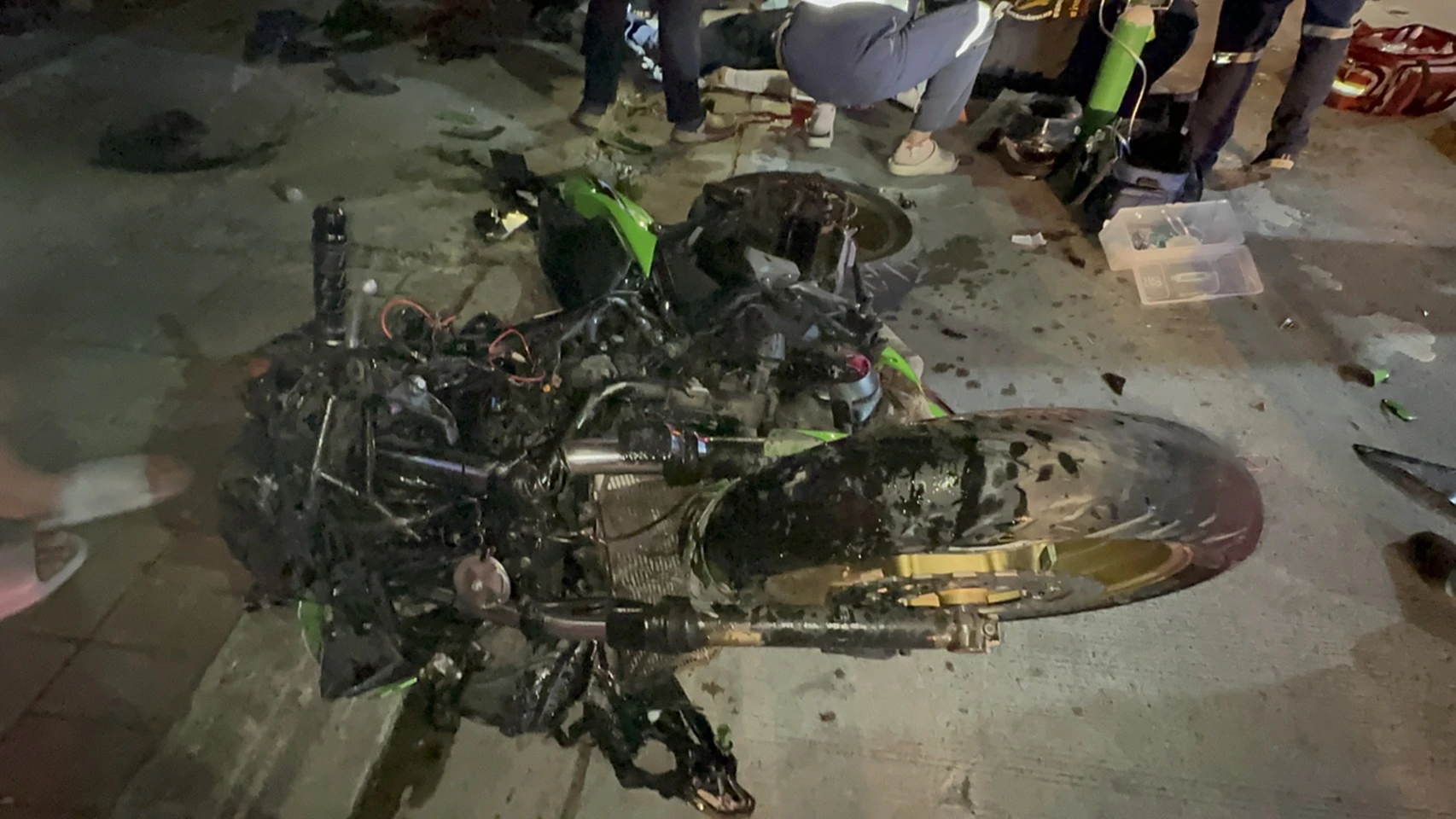 ที่เกิดเหตุพบรถจักรยานยนต์บิ๊กไบค์ ยี่ห้อฮอนด้า CBR 650 ซีซี สีเขียวดำ สภาพพังยับเยิน ล้มอยู่ข้างถนน ห่างออกไปเล็กน้อยพบผู้บาดเจ็บชายอายุ 23 ปี นอนหมดสติจมกองเลือด มีบาดแผลฉีกขาดหลายแห่ง เจ้าหน้าที่กู้ภัยและทีมแพทย์เร่งให้การปฐมพยาบาล ก่อนรีบนำตัวส่งโรงพยาบาลเมืองพัทยาเป็นการด่วน