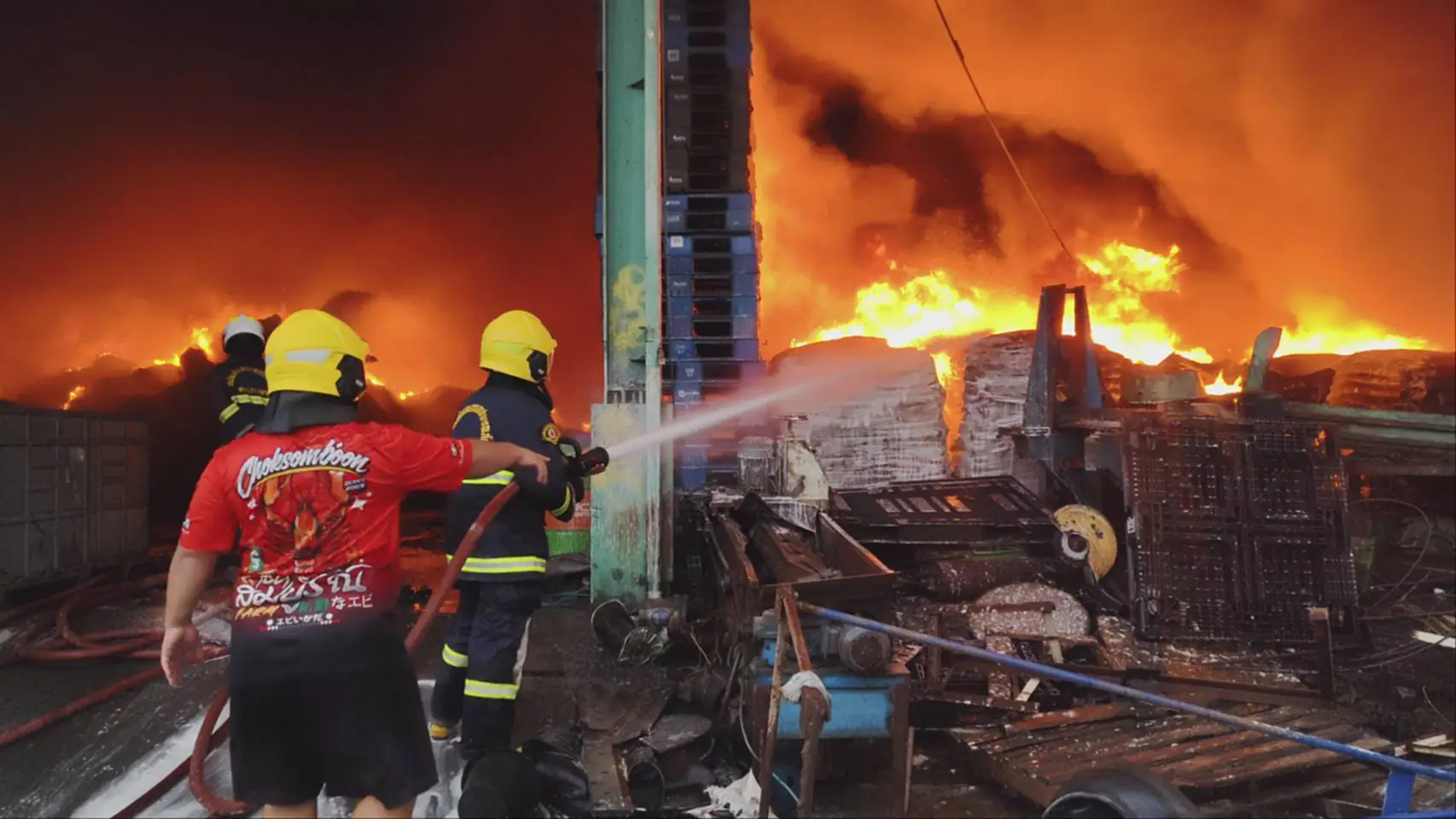 ไฟลุกโหมกลางดึก! โรงงานรีไซเคิลยางบางปลา เพลิงพวยพุ่ง คุมไม่อยู่