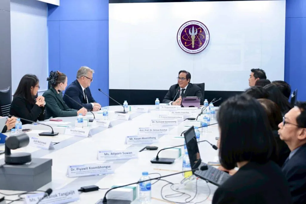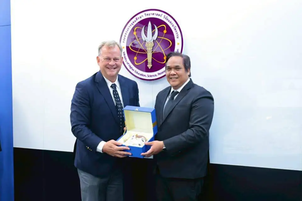 เมื่อวันที่ 10 พ.ย. 68 ดร.พันธุ์เพิ่มศักดิ์ อารุณี ผู้ช่วยปลัดกระทรวงการอุดมศึกษา วิทยาศาสตร์ วิจัยและนวัตกรรม (อว.) พร้อมด้วยผู้บริหารจากสำนักงานคณะกรรมการส่งเสริมวิทยาศาสตร์ วิจัยและนวัตกรรม (สกสว.) สำนักงานสภานโยบายการอุดมศึกษา วิทยาศาสตร์ วิจัยและนวัตกรรมแห่งชาติ (สอวช.) สำนักงานพัฒนาวิทยาศาสตร์และเทคโนโลยีแห่งชาติ (สวทช.) สำนักงานนวัตกรรมแห่งชาติ (องค์การมหาชน) และมหาวิทยาลัยเทคโนโลยีมหานคร หารือร่วมกับคณะผู้บริหารหอการค้าอเมริกันในประเทศไทย (The American Chamber of Commerce in Thailand: AMCHAM) นำโดย Ms. Heidi Gallant, Executive Director and Vice President of AMCHAM Thailand Foundation และ Mr. John Evans, AMCHAM Governor เพื่อแลกเปลี่ยนแนวทางความร่วมมือในการสนับสนุนโอกาสทางการศึกษาแก่เยาวชนไทย และพัฒนากำลังคนรองรับอุตสาหกรรมเป้าหมายของประเทศ โดยเฉพาะด้าน เซมิคอนดักเตอร์ ปัญญาประดิษฐ์ (AI) และ ยานยนต์ไฟฟ้า (EV) ณ ห้องประชุม 3A ชั้น 3 อาคารพระจอมเกล้า สำนักงานปลัดกระทรวง อว.