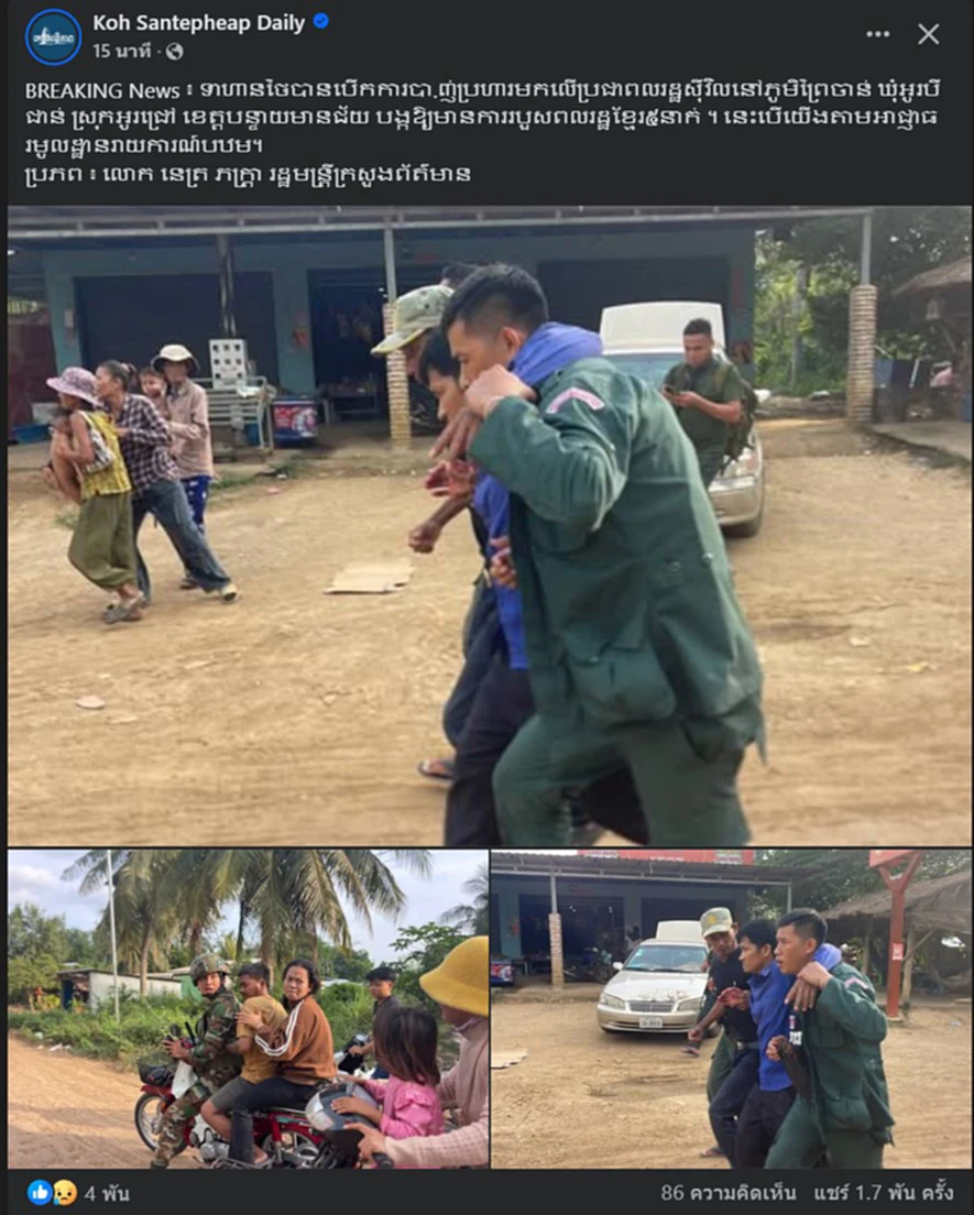 ขณะที่สื่อกัมพูชา Fresh News รายงานว่า ทหารไทยใช้อาวุธยิงเข้าเขตอธิปไตยกัมพูชา ทำให้ชาวบ้านในหมู่บ้านเปรยจันทร์ได้รับบาดเจ็บ 5 ราย โดยรัฐมนตรีว่าการกระทรวงสารสนเทศกัมพูชาได้เผยแพร่ภาพและคลิปเหตุการณ์ผ่านสื่อและโซเชียลอย่างกว้างขวาง