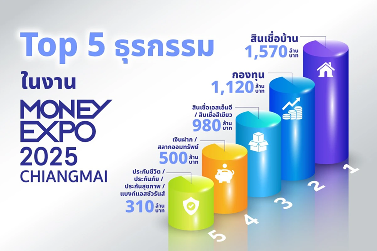 งานมหกรรมการเงินเชียงใหม่ ครั้งที่ 20 MONEY EXPO 2025 CHIANGMAI ที่ วารสารการเงินธนาคาร จัดขึ้นในวันที่ 7-9 พฤศจิกายน 2568 มียอดธุรกรรมทั้งออฟไลน์และออนไลน์กว่า 5,000 ล้านบาท สินเชื่อบ้านพุ่งอันดับ 1 รวมกว่า 1,570 ล้านบาท ยอดซื้อกองทุนกว่า 1,120 ล้านบาท สินเชื่อ SMEs มีผู้ประกอบการยื่นกู้กว่า 980 ล้านบาท