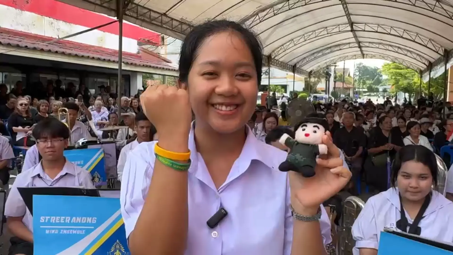 “น้องบางคนถ้ามีเวลาจะเป็นจิตอาสา ตามที่พระบาทสมเด็จพระเจ้าอยู่หัว ท่านอยากให้พี่น้องคนไทย ให้มีจิตส่วนหนึ่ง เผื่อมีเวลาช่วยเหลือเพื่อนร่วมชาติบ้าง จะผูกผ้าพันคอเหลืองหมวกฟ้า หรือบางครั้งน้องไม่มีผ้าพันคอเหลืองหรือเตรียมไม่ทัน ก็เอาตัวน้องนั่นแหละไปช่วย รถล้มข้างหน้าอย่าผ่านไป เรือล่มอยู่ข้างหน้าอยู่ริมฝั่งหน้าบ้านของน้อง ลงไปช่วยเขา หาอะไรช่วยเขา อย่าปล่อยผ่านไป เห็นเพื่อนบ้านเรายากจน หลังคารั่ว อยู่กับยายแก่ๆ น้องไม่มีเรี่ยวแรงอะไร สังคมเราช่วยกัน นั่นคือจิตอาสาที่พระบาทสมเด็จพระเจ้าอยู่หัวท่านอยากให้พี่น้องคนไทยทั้งหลาย มีจิตใจดี ก็ช่วยให้ประเทศชาติเจริญรุ่งเรืองได้”