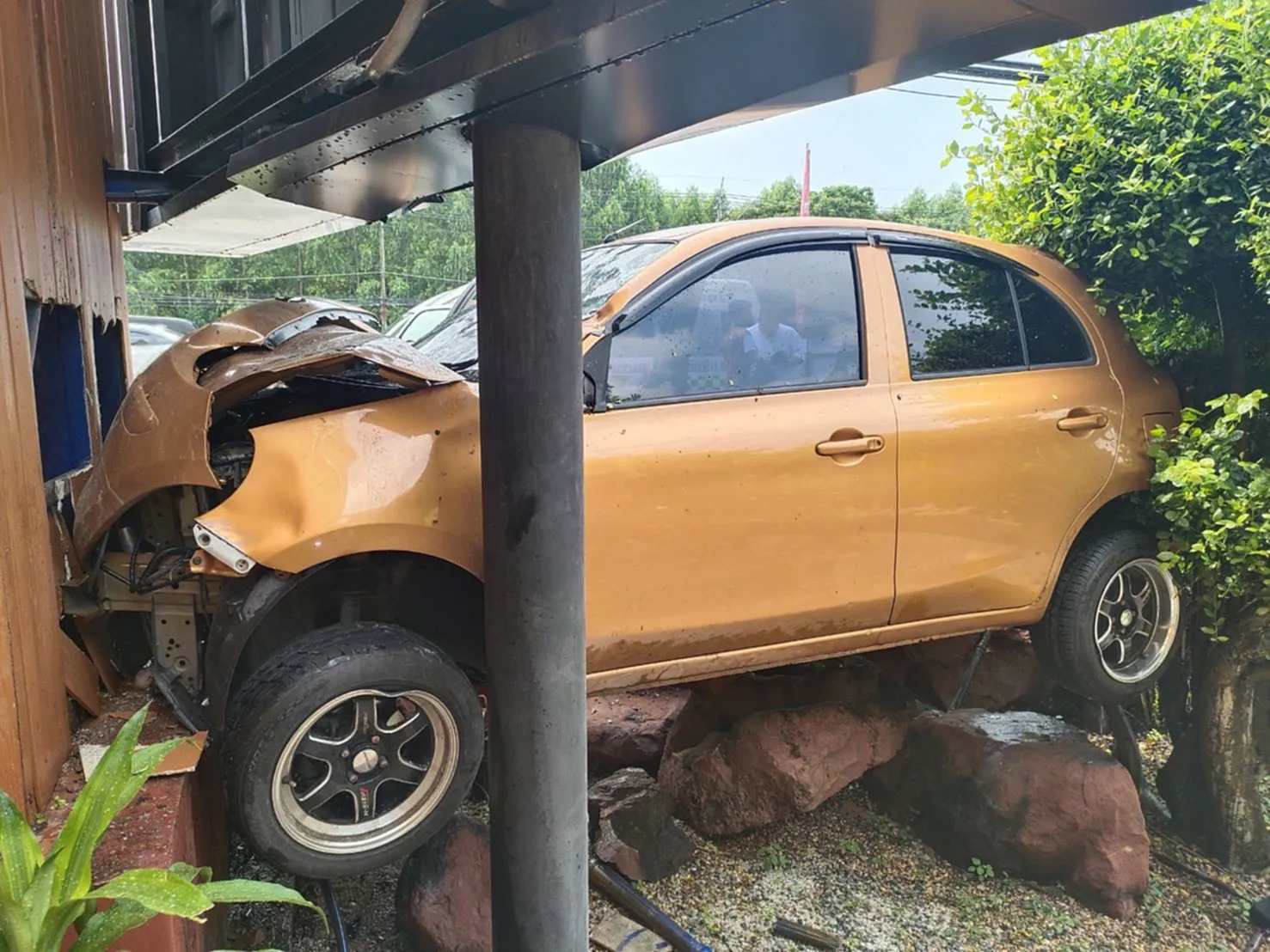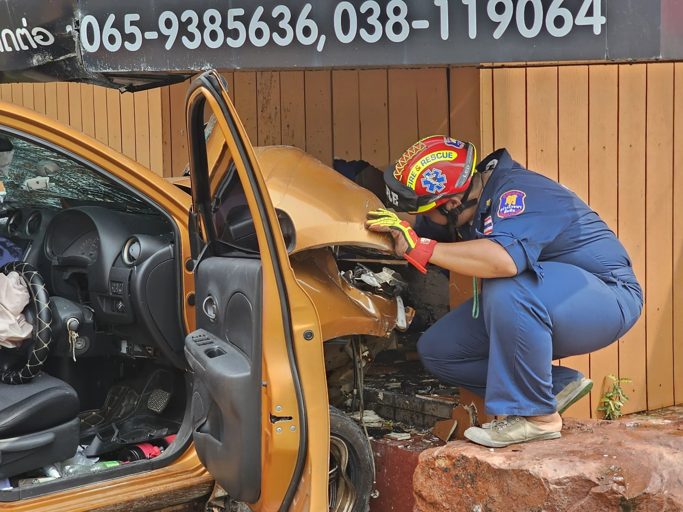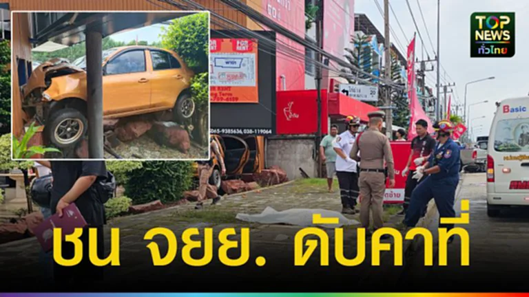 เก๋ง ชน จยย. ดับคาที่ ก่อนพุ่งขึ้นไปค้างบนกำแพงร้าน ริมถนนสุขุมวิท