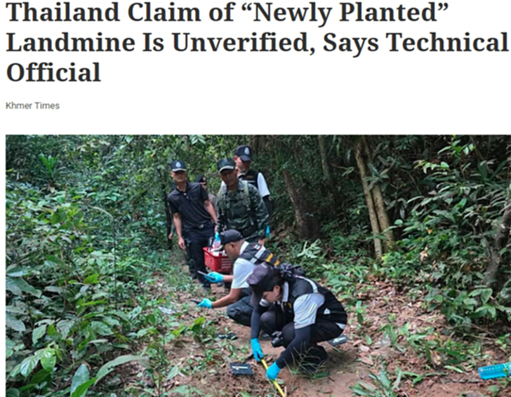 ขแมร์ไทม์สรายงานวันนี้ (ศุกร์ที่ 14 พย.) ว่าเจ้าหน้าที่เทคนิคของกัมพูชาได้ให้สัมภาษณ์กับขแมร์ไทม์สว่ากัมพุชาไม่ยอมรับคำพูดของฝ่ายไทยที่ยืนยันว่าทุ่นระเบิดที่ทำให้ทหารไทยได้รับบาดเจ็บขณะลาดตระเวนเมื่อวันที่ 10 พฤศจิกายนที่ผ่านมาว่า “เป็นทุ่นระเบิดฝังใหม่” โดยระบุว่าข้อกล่าวอ้างของไทยยังไม่ได้รับการยืนยัน เนื่องจากคณะผู้สังเกตการณ์อาเซียน (AOT) ยังไม่ได้เข้าไปสำรวจที่จุดเกิดเหตุ