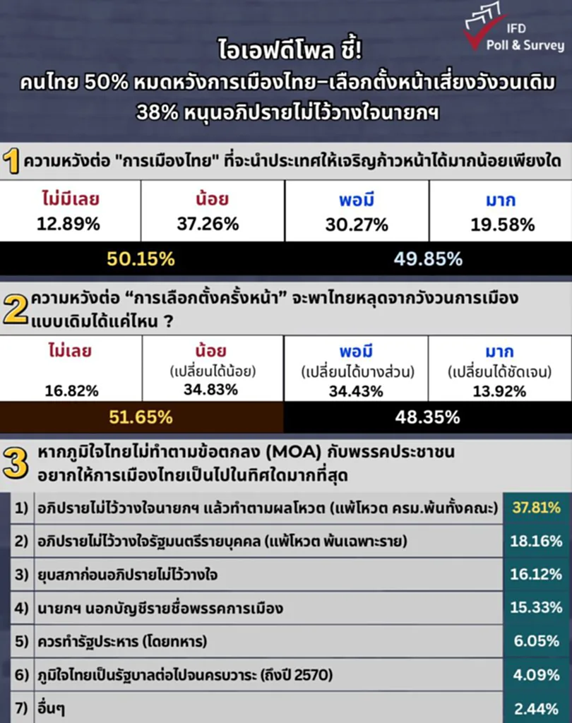 ไอเอฟดีโพลสำรวจความเห็นประชาชนว่า “ความหวังต่อการเมืองไทยวันนี้ “กึ่งต่อกึ่ง” ฝั่ง “น้อย/ไม่มีเลย” รวม 50.15% สูงกว่าฝั่ง “มาก/พอมี” รวม 49.85% โดย “น้อย” สูงสุด 37.26%, “พอมี” 30.27%, “มาก” 19.58%, “ไม่มีเลย” 12.89% ส่วน ความหวังว่า “เลือกตั้งครั้งหน้า” จะพาไทยเสียงอยู่ในรูปแบบการเมืองเดิมๆ โดยฝั่ง “น้อย/ไม่เลย” รวม 51.65% สูงกว่า “พอมี/มาก” รวม 48.35% และโดย “พอมี (เปลี่ยนได้บางส่วน)” 34.43%, “น้อย (เปลี่ยนได้น้อย)” 34.83%, “ไม่เลย” 16.82%, “มาก (เปลี่ยนได้ชัดเจน)” 13.92%