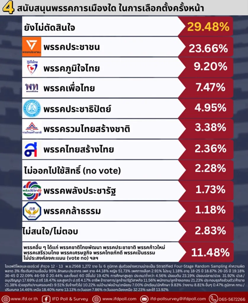 วันที่ 14 พ.ย. 2568 ศ.ดร.เกรียงศักดิ์ เจริญวงศ์ศักดิ์ (ดร.แดน) ประธานสถาบันการสร้างชาติ ประธานสถาบันอนาคตศึกษาเพื่อการพัฒนา และนางจิตติมา บุญวิทยา ผู้อำนวยการไอเอฟดีโพลและเซอร์เวย์ ร่วมแถลงผลการสำรวจความคิดเห็นประชาชนไทยตั้งแต่ 18 ปีขึ้นไป เรื่อง “คนไทย 50% หมดหวังการเมือง–เลือกตั้งหน้าเสี่ยงวนเดิม 38% หนุนอภิปรายไม่ไว้วางใจนายกฯ” 1,272 ตัวอย่าง สำรวจ 12 – 13 พ.ย. 2568 ใน 6 ภูมิภาค โดยการลงภาคสนามและการโทรศัพท์ สุ่ม‍ตัวอย่างความน่าจะเป็น Stratified Four-Stage Random Sampling ค่าความผิดพลาด 3% ที่ระดับความเชื่อมั่น 95%