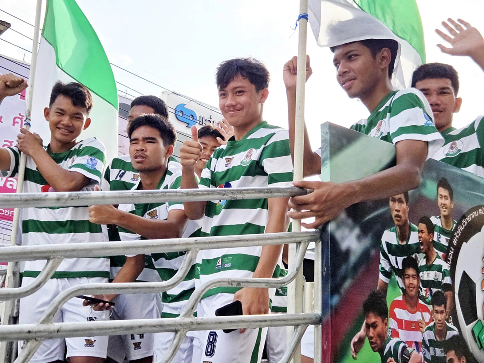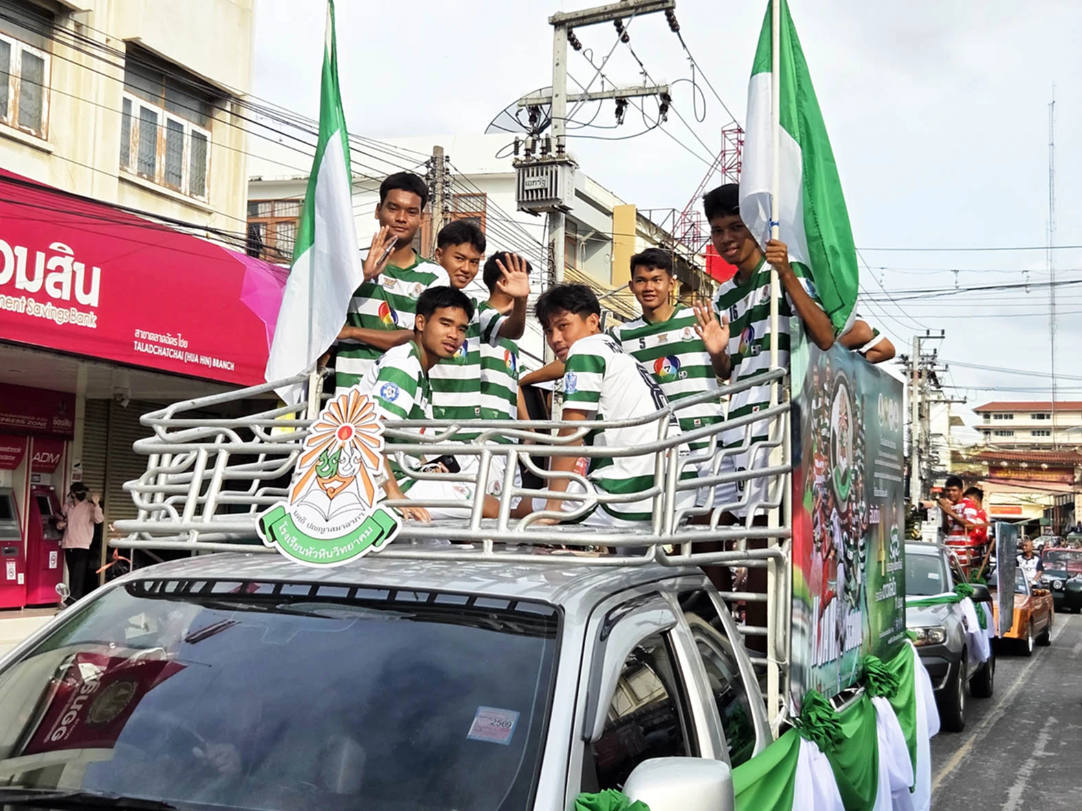 ก่อนพิธีต้อนรับอย่างเป็นทางการ ได้มีการจัดขบวนแห่นักกีฬาฟุตบอล โรงเรียนหัวหินวิทยาคม พร้อมโค้ชและผู้ฝึกสอน ออกเดินสายตามถนนต่าง ๆ ในเขตเทศบาลนครหัวหิน เพื่อร่วมเฉลิมฉลองความสำเร็จของทีม บรรยากาศตลอดเส้นทางเต็มไปด้วยรอยยิ้มจากประชาชนและแฟนคลับจำนวนมากที่ออกมาต้อนรับ มอบช่อดอกไม้ แสดงความยินดี และร่วมถ่ายภาพกับนักเตะอย่างคึกคัก เป็นอีกหนึ่งภาพประทับใจที่สะท้อนพลังของชุมชนหัวหินที่ให้การสนับสนุนเยาวชนอย่างอบอุ่น