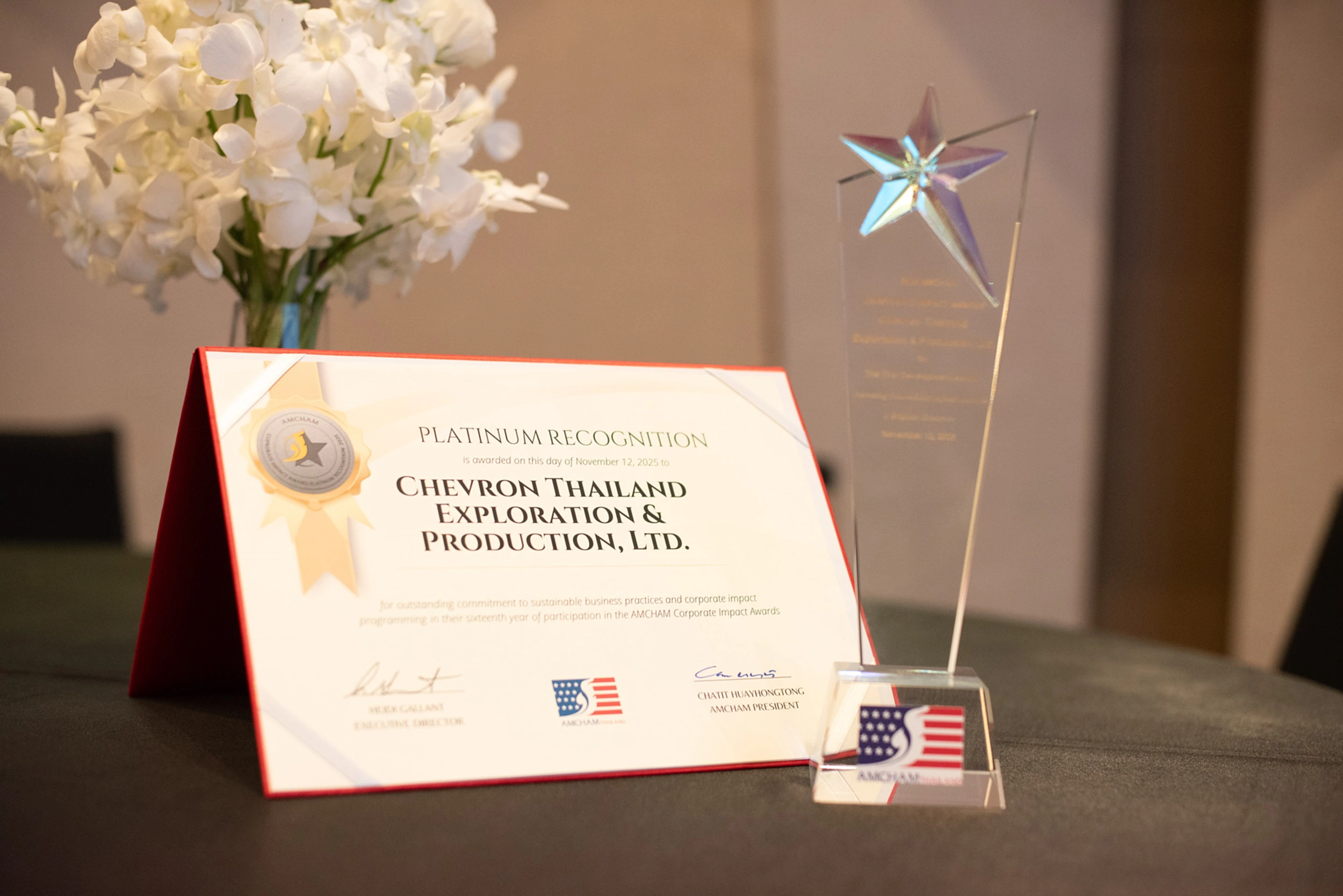 ในส่วนของรางวัลองค์กรที่มีความรับผิดชอบต่อสังคมดีเด่น (AMCHAM Corporate Social Impact Awards) นั้น จัดขึ้นเป็นประจำทุกปี เพื่อยกย่องบริษัทสมาชิกหอการค้าอเมริกันในประเทศไทยที่เป็นแบบอย่างในการดำเนินธุรกิจควบคู่กับการทำกิจกรรมเพื่อสังคม โดยบริษัท เชฟรอนประเทศไทยสำรวจและผลิต จำกัด ได้รับรางวัลองค์กรที่มีความรับผิดชอบต่อสังคมดีเด่นประจำปี 2568 (AMCHAM Corporate Social Impact Award) ในระดับแพลตินัม ติดต่อกันเป็นปีที่ 16 จากการดำเนินงานด้านการส่งเสริมสังคมมาอย่างต่อเนื่อง ภายใต้กรอบกลยุทธ์ ESG หรือ การอนุรักษ์สิ่งแวดล้อม (Environment) การทำประโยชน์เพื่อสังคม (Social) และการดำเนินธุรกิจอย่างโปร่งใสและเป็นธรรม (Governance) ทั้งนี้ รางวัลที่ได้รับตอกย้ำความมุ่งมั่นของเชฟรอน ในฐานะบริษัทด้านพลังงานระดับโลกที่มุ่งพัฒนาและส่งเสริมคุณภาพชีวิตของสังคมไทยให้แข็งแกร่ง โดยตลอดระยะเวลากว่า 60 ปี ที่บริษัทฯ ได้ดำเนินธุรกิจในประเทศไทย บริษัทฯ ได้พัฒนาโครงการเพื่อสังคมกว่าหลายร้อยโครงการในหลายพื้นที่ทั่วประเทศอย่างต่อเนื่อง
