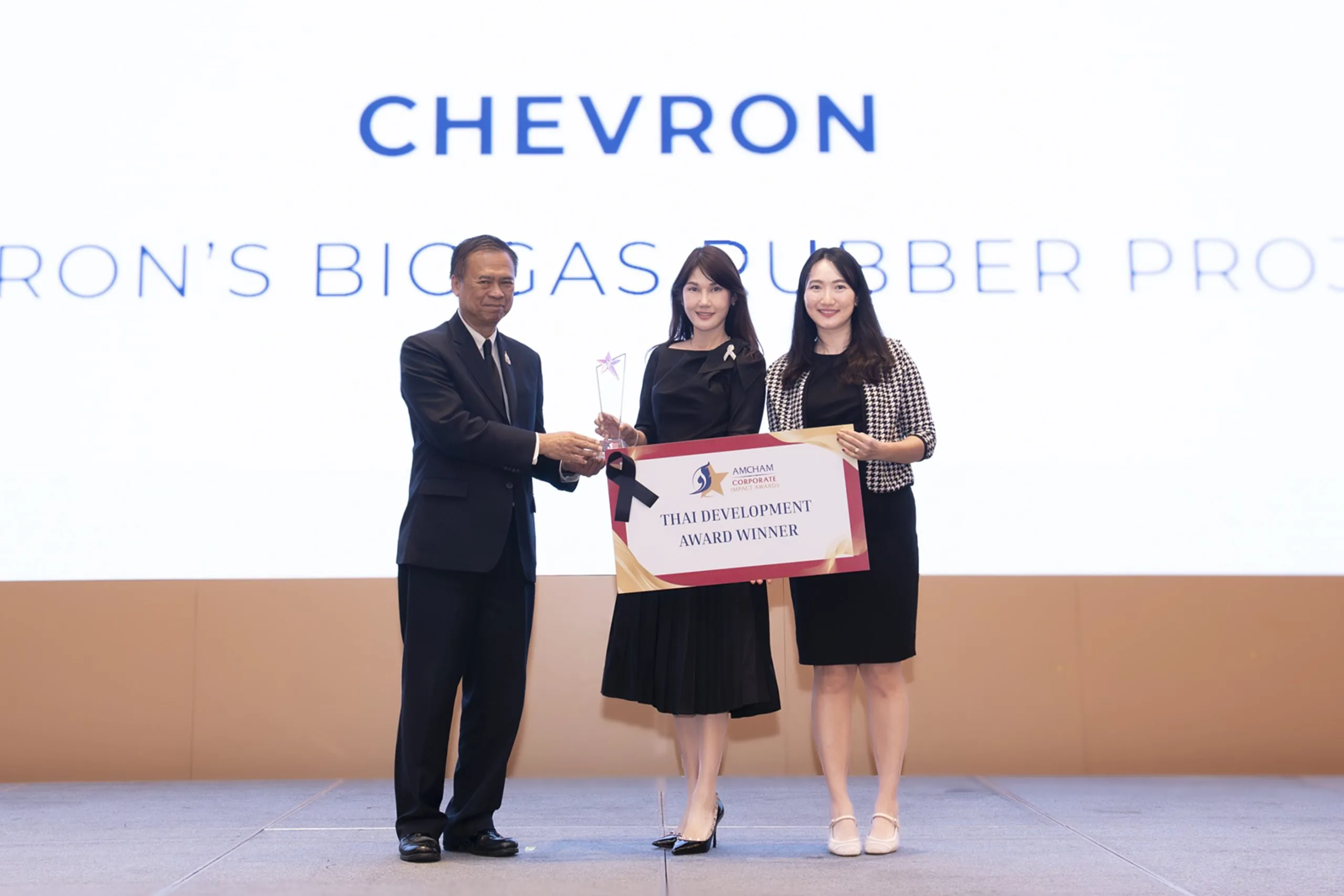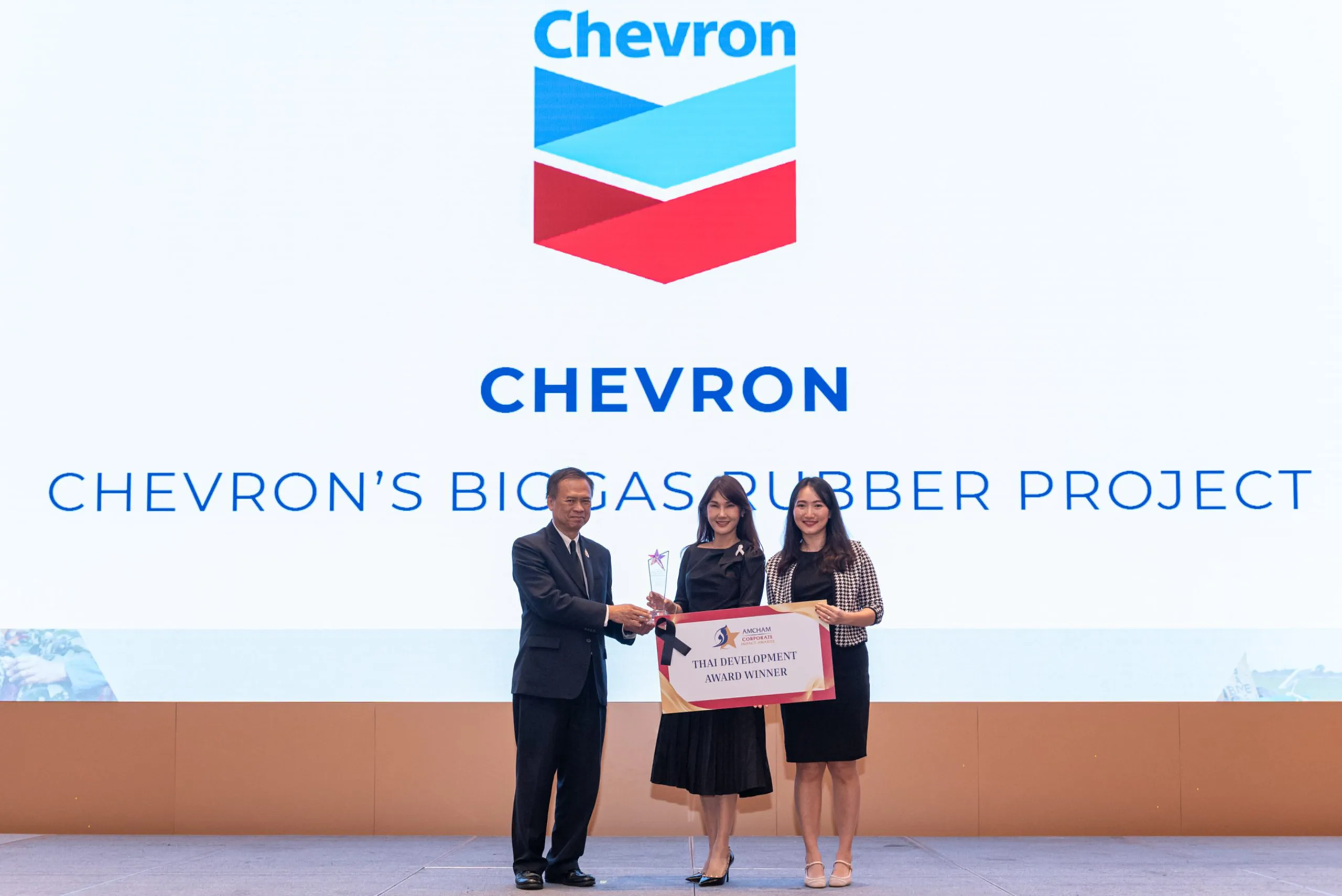 รางวัล “Thai Development Award” เป็นหนึ่งในสามรางวัลพิเศษที่มอบให้แก่องค์กรที่จัดทำโครงการที่สร้างผลกระทบเชิงบวกต่อสังคม ซึ่งเชฟรอนได้รับรางวัลนี้ จากโครงการ “ก๊าซชีวภาพสหกรณ์ยางพาราสู่สังคมคาร์บอนต่ำ” ที่เป็นความร่วมมือกับสถาบันวิจัยระบบพลังงาน (PERIN) มหาวิทยาลัยสงขลานครินทร์ ในการมอบความรู้ให้กับชุมชน นำระบบก๊าซชีวภาพ ระบบพลังงานแสงอาทิตย์ และโมเดล Zero Waste มาใช้ในกระบวนการรมควันยางแผ่น เพื่อเปลี่ยนน้ำเสียเป็นก๊าซชีวภาพและนำมารมควันจนได้ ‘ยางแผ่นรมควันคาร์บอนต่ำ’ เป็นผลสำเร็จ และสามารถแก้ปัญหาสิ่งแวดล้อม เช่น กลิ่นเหม็นและน้ำเสียจากการผลิตยางรมควันแบบดั้งเดิมของกลุ่มเกษตรกรชาวสวนยาง