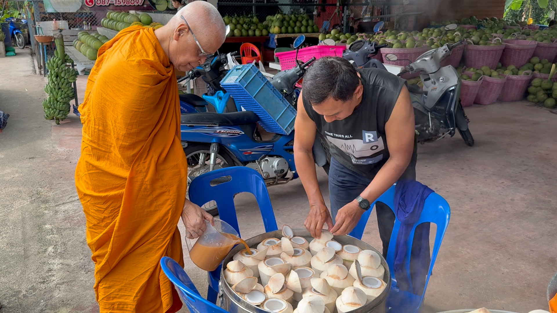 — พระเมธีวัชระประชาทร (ผศ.ดร.หลวงพ่อแดง นันทิโย) เจ้าอาวาสวัดอินทาราม และผู้อำนวยการหน่วยวิทยบริการ มจร. วัดอินทาราม ลงพื้นที่เยี่ยมการเปิดร้าน “สังขยามะพร้าวอ่อน” ริมถนนแควอ้อม อำเภออัมพวา ซึ่งนักศึกษาหน่วยวิทยบริการ มจร. วัดอินทาราม ร่วมกันจัดขึ้น เพื่อช่วยเหลือชาวสวนมะพร้าวน้ำหอมที่ประสบปัญหาราคาตกต่ำ และเพื่อสร้างรายได้สนับสนุนโครงการเรียนฟรีของวัดอินทาราม โดยจำหน่ายชุด 5 ลูก ราคา 200 บาท และน้ำมะพร้าวแก้วละ 15 บาท