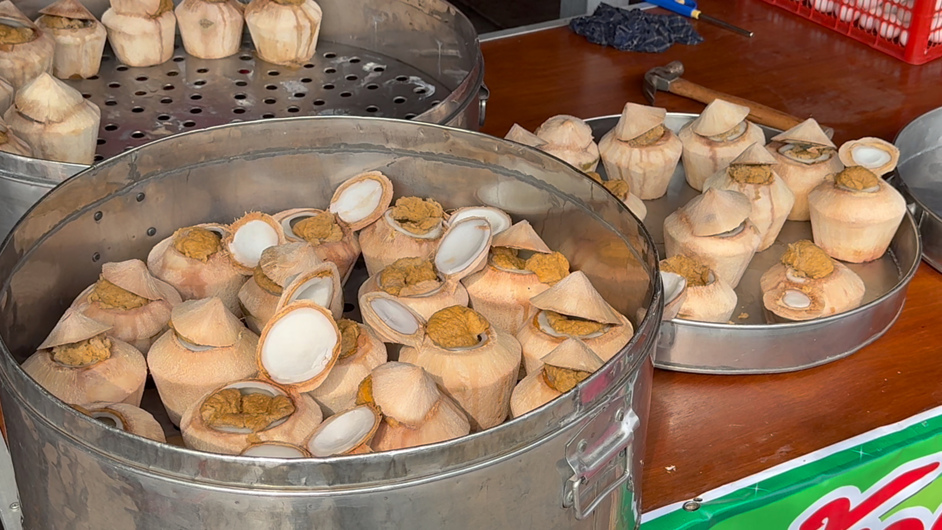 — สังขยามะพร้าวอ่อนจำหน่ายในราคา 40 บาทต่อลูก หรือชุดละ 200 บาท และน้ำมะพร้าวอ่อนบรรจุแก้วแพ็คอย่างดีแก้วละ 15 บาท จุดขายคือความสด หอม และทำโดยนักศึกษาตั้งใจจริง หลวงพ่อแดงกล่าวว่า “อิ่มท้อง อิ่มใจ ได้บุญ” คือหัวใจของกิจกรรมครั้งนี้