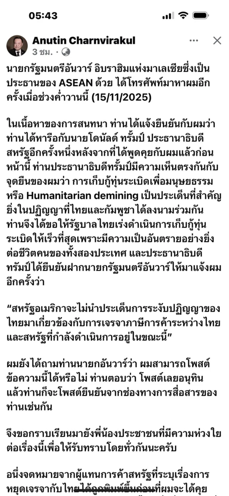 ในเนื้อหาของการสนทนา ท่านได้แจ้งยืนยันกับผมว่า ท่านได้หารือกับนายโดนัลด์ ทรัมป์ ประธานาธิบดีสหรัฐอีกครั้งหนึ่ง หลังจากที่ได้พูดคุยกับผมแล้วก่อนหน้านี้ ท่านประธานาธิบดีทรัมป์มีความเห็นตรงกันกับจุดยืนของผมว่า การเก็บกู้ทุ่นระเบิดเพื่อมนุษยธรรม หรือ Humanitarian demining เป็นประเด็นที่สำคัญยิ่งในปฏิญญาที่ไทยและกัมพูชาได้ลงนามร่วมกัน ท่านจึงได้ขอให้รัฐบาลไทยเร่งดำเนินการเก็บกู้ทุ่นระเบิดให้เร็วที่สุดเพราะมีความเป็นอันตรายอย่างยิ่งต่อชีวิตคนของทั้งสองประเทศ และประธานาธิบดีทรัมป์ได้ยืนยันฝากนายกรัฐมนตรีอันวาร์ให้มาแจ้งผมอีกครั้งว่า
